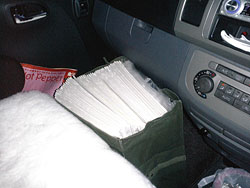 今朝は天気が良かったので歩いて配達する事ができました~。その代わり、玲佳に昨日ほどのやる気が見られなかった・・・。(^^;明日で代配は終わりです。あと一日頑張るぞ~ → 今日は昨日より新聞が厚かった。最初はこれだけあった新聞も・・・ 歩いて配る頃にはこれくらいに減っています。 → 配達袋のこのタスキ紐を・・・ このように肩にかけて運びます。 → 今日も玲佳はタントに乗ってスタンバイ リードを付けて歩き配達の出発だ~。しっぽ下がってますよ、お嬢さん。