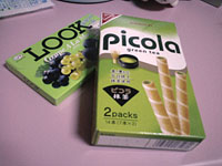 お友達の住んでらっしゃる所によっては梅雨入りしたそうですね~。嫌な時期がやって来てしまいました。私の住む金沢では、梅雨入りはしていないものの、今日は蒸してました。そのせいで、昼過ぎに起きてから頭が重~い。非常に気分の悪い一日でした。金沢の梅雨入りもそろそろです。 最近、お菓子づいてる私。今日のお菓子は絶対お友達に教えたかったのです。ナビスコ『ピコラ 抹茶味』。これ、抹茶好きにはたまらんと思います!普通、抹茶チョコって風味はあっても苦味は無いですよね?ところがコレには、抹茶の苦味があるんです。まだ食べた事ない「抹茶好きさん」は是非食べてみてくださいね~※写真奥は昨日の日記のコメントに出てきたLOOKのグレープ。 買ってみました。食べるのは今から~。