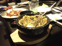 石焼ビビンバ 混ぜ完了石鍋側面にはりつけの図 実は昨日の夕飯も焼肉だった私。今日も焼肉食べに行きました。最近体調良くないから焼肉食べて元気つけなくちゃね。今朝、母に「昨日おジイとおバアと焼肉行ってん。」と教えたら「ずるい!なんで誘わんげんて!」と怒られ、父が行きたがってたお店『がんこ炎』に行ってきました。大人5人で行って、4人がけの席に座らされた(隣は7人の客が6人がけの席に座らされてた)ので、「満席なのは分かるけど、これはどうやろう・・・。」と。夕飯ってゆったり食べるものじゃないですか?押し込められて、かなりゲンメツ。肉も特別良いわけでもなかったし。もちろん良い点もありましたよ。タレが5種類(甘口・辛口・豚骨塩・柚子こしょう・おろしポン酢)から自由に使えるのが良いと思いました。一通り試しましたけど、どれもおいしかったですよ。ソフトドリンクがドリンクバーなのも良いね。でも総合で考えて、多分うちはもう行かないだろうな。友達とだったら付き合いで・・・。
