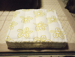 今日は玲佳の夏用座布団を買いました。冬用は毛モコモコのクッションなので、母に「玲佳ちゃんに夏用の座布団買ってあげんなんね~。」と言われていたんです。厚さ8cm位ある固めの座布団クッション。固めで、綿を固定するための縫いが数箇所あるためでこぼこしてるせいか、イマイチ座りにくいみたい。う~ん、上にフワフワの何かを敷かなきゃ気に入ってくれないかもなぁ。涼しそうな素材でフワフワしたもの、探すか~。玲佳の為なら、お母さん出費しても構わないぞー手前に何故か取っ手がついてます 上に玲佳をトッピングして完成「私の新しい座布団ざますの。おほほ。」 新しい座布団うれしいね~。