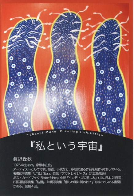 さて、展覧会まで、約3週間ほどとなりました。改めて、詳しい展覧会情報のお知らせをさせていただきます。眞野丘秋絵画展『私という宇宙』2008年6月11(水)~6月15(日)AM10:00~PM17:00(最終日16:00まで)ギャラリーいとー TEL(0749-23-4741)滋賀県彦根市本町2-1-5(夢京橋キャッスルロード)彦根駅から湖国バス彦根市立病院線(南回り)3分タクシー5分、バス3分07年8月~08年3月までに制作した、6~30号の約30点のアクリル画作品を展示いたします。絵画購入希望の方は、会場にてご相談ください。<展覧会にあたって>この展覧会では、07年8月~08年4月までに制作したアクリル画、約30点を展示します。01年より続く、うつ病と付き合いながらの制作で、特にこの9ヶ月間は、自分と向き合い、自分の持てる力の精一杯を表現する期間となりました。展覧会タイトルに『私という宇宙』とありますように、「私」と向き合うと、おのずと宇宙と繋がるものです。この展覧会の作品群は、宇宙に遍在する色や模様、形やエネルギーをキャンバスに移したものになっています。まだまだ至らない部分が多いかと存じますが、お越し頂いた皆さんに、宇宙のエネルギーと接し、交流していただけたら幸いです。皆様のお越しをお待ちしております。