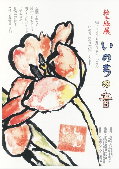昨日は、滋賀県彦根市野瀬町の住宅展示場「エースホーム彦根店」で開かれてる『小川駿治絵手紙展』に行ってきました。(問い合わせ0749-30-3565)動植物などが描かれた水彩画に素朴な句を入れた、俳画のような絵手紙作品です。駿治くんは心臓病(ファロー四徴症)とその他の障がいを抱えながら、明るく元気に生きている10歳の少年です。絵手紙は480枚あり、駿治くんのお父さんが勤める「エースホーム彦根店」のモデルハウスの中に展示されています。幼いころから、大きな大変な体験をして、さぞ強い魂の持ち主だと思います。親御さんの献身的なサポートも目に浮かんできます。絵手紙にかかれている句(コメント)は、どれも純粋なものばかりで、自分の子供時代を思い出しました。生と死の狭間で描かれたような作品なので、作品からは「生きる」という強いメッセージが伝わってきます。彼の作品の特徴は、10歳にして卓越した絵画技術を持ちながら、溢れるような生命エネルギーを放出し、天使のような清らかさを持ち合わせているということでしょう。駿治くん本人とお母さんに直接お会いし、お話することができましたが、とてもよいエネルギー交換をすることができました。できれば駿治くんの画集を作ってほしい。もっと多くの人に駿治くんの作品を観てもらいたい、と思いました。世の中にはたくさんのアーティストがいて、心を揺さぶられるような作品に出会えることは稀ですが、この素晴らしい展覧会は、私もここで紹介しておきたいと思います。会期は7月末までだそうです。