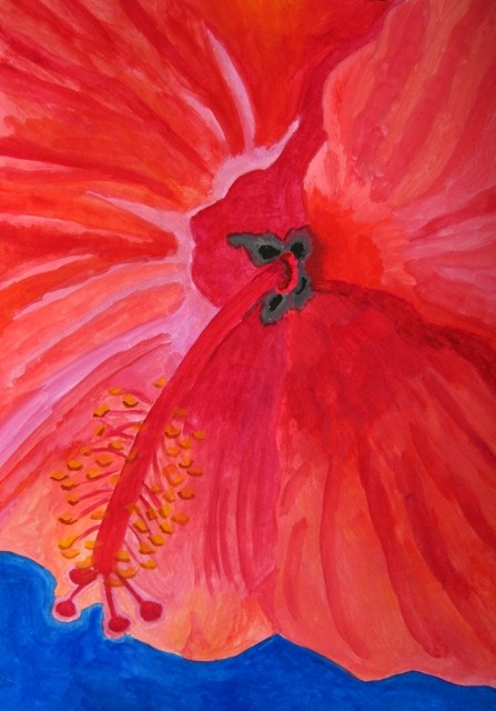 今日は気持ちのよい日でした。最高気温は28℃でした。これぐらいの気温ですと、頭も明晰になって、いろいろと行動することもできますね。昨日、アトリエのエアコンが壊れていることが判明し、急遽、新しいものを注文しました。昨日までは33℃の中、なかなか室温が下がらないな~と思いながら、ぐったりしながら絵を描いていました。しかし今日はクーラーもいらず、気持ちよく絵を描くことができました。忍耐、辛抱、意志の強さは大事とはいえ、取り巻く環境も、とても大切なものだと実感しました。コンディションによって、絵の出来はだいぶ変わります。今は夜ですが、窓を開けると、気持ちのよい涼しい風が部屋に入ってきます。虫の声も聞こえますし、まるで秋の風のような感じがします。明日もそれほど暑くはならないようです。気持ちよく、快適に過ごしたいものですね。今日は、先日描いたハイビスカスの絵を載せます。四つ切画用紙に水彩です。意識しているわけではありませんが、ちょっとジョージア・オキーフに似ているかもしれません。