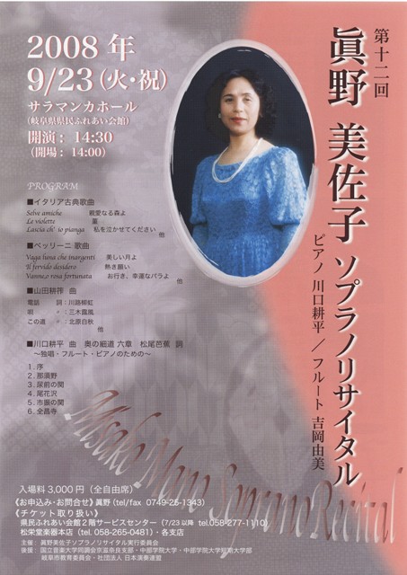 今日は、母のリサイタルのお知らせです。本番までに3か月ほどありますので、これから月に1度ペースでお知らせをさせていただきます。第12回 眞野美佐子ソプラノリサイタルソプラノ/眞野美佐子 ピアノ/川口耕平 フルート/吉岡由美日時:2008年9月23日(火・祝)場所:岐阜県県民ふれあい会館 サラマンカホール開場14:00 開演14:30 プログラム★イタリア古典歌曲 selve amiche(親愛なる森よ) Le violette Lascia ch' io pianga(私を泣かせてください) 他★ベッリーニ歌曲 Vaga luna che inargenti(美しい月よ) Il fervido desidero(熱き願い) Vanne,o rosa fortunata(お行き、幸運なバラよ) 他★山田耕筰 曲 ・電話(詞 川路柳虹) ・唄(詞 三木露風) ・この道(詞 北原白秋) 他★川口耕平 曲 奥の細道 六章(詞 松尾芭蕉) 1.序 2.那須野 3.尿前の関 4.尾花沢 5.市振の関 6.全昌寺 入場料3,000円(全自由席)お申し込み・お問い合わせ:眞野美佐子ソプラノリサイタル実行委員会 TEL&FAX 0749-25-1343<チケット取扱い>県民ふれあい会館2階サービスセンター (7/23日以降 TEL058-277-1110) 松栄堂楽器本店 TEL058-265-0481 眞野美佐子プロフィール国立音楽大学声楽科卒業。’77年を初めとし、名古屋市、岐阜県大垣市、滋賀県大津市、彦根市、京都市において計11回のリサイタルを開催。その他、3回のジョイントリサイタルを開催。’75年イタリアにおいて研修。’86年イタリア・シエナにおける夏期国際セミナーに参加し、ダニエル・フェルロクラスにて研修。元NHK交響楽団トランペット首席奏者、北村源三氏の「東京トランペットカルテット」との共演のほか、数多くの演奏会に出演し、地道な活動を続け、独自の世界を創り上げている。特にイタリアと日本の歌に取り組み、古典から現代までの幅広い作品のプログラムでのリサイタルを重ねてきた。’96年京都府民ホールアルティーで行われた、川口耕平氏のピアノ伴奏によるリサイタルでは、氏の編曲構成による「歌と語りによる宮澤賢治の音楽」13曲を歌い、宮澤賢治の音楽世界を紹介した。このときのライブ録音は、国際芸術連盟によりCDとして制作され、NHK、テレビ朝日、読売テレビなどのメディアに取り上げられ、全国から大きな反響を呼んだ。’05年岐阜県大垣市主催による「芭蕉生誕360年祭」において、川口耕平氏作曲「松尾芭蕉 奥の細道 六章」を演奏する。一方、ヴォイストレーナー、合唱指導者としても活動し、柔らかな美しい響きの女性合唱の育成に力を注ぎ、数多くの演奏会を催している。 故・西内静、故・内本実、故上浪明子の各氏に師事。日本演奏連盟会員、ムジカ国際音楽協会会員、大垣女子短期大学教授を経て現在、中部学院大学教授。論文に「宮澤賢治の音楽をめぐって」「短期大学における声楽専攻学生の発声指導について」がある。 主催:眞野美佐子ソプラノリサイタル実行委員会後援:国立音楽大学同調会京滋奈良支部、 中部学院大学、中部学院大学短期大学部 岐阜市教育委員会、社団法人・日本演奏連盟