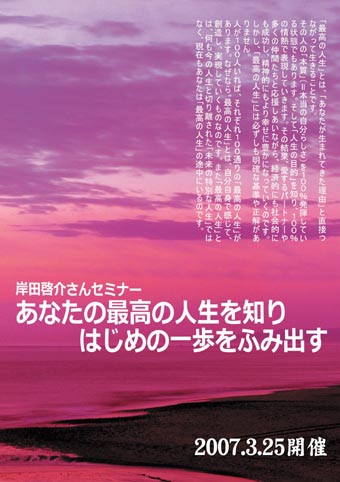 けいちゃんセミナーのポストカードをつくりました印刷してみたらけっこう素敵だったのでブログにも掲載しちゃいますけいちゃんのイメージは紫だったのと今回セミナー会場が海なのでそのイメージでつくってみました当日は、その場にいるみんなでこんな紫色の夕日がみたいです