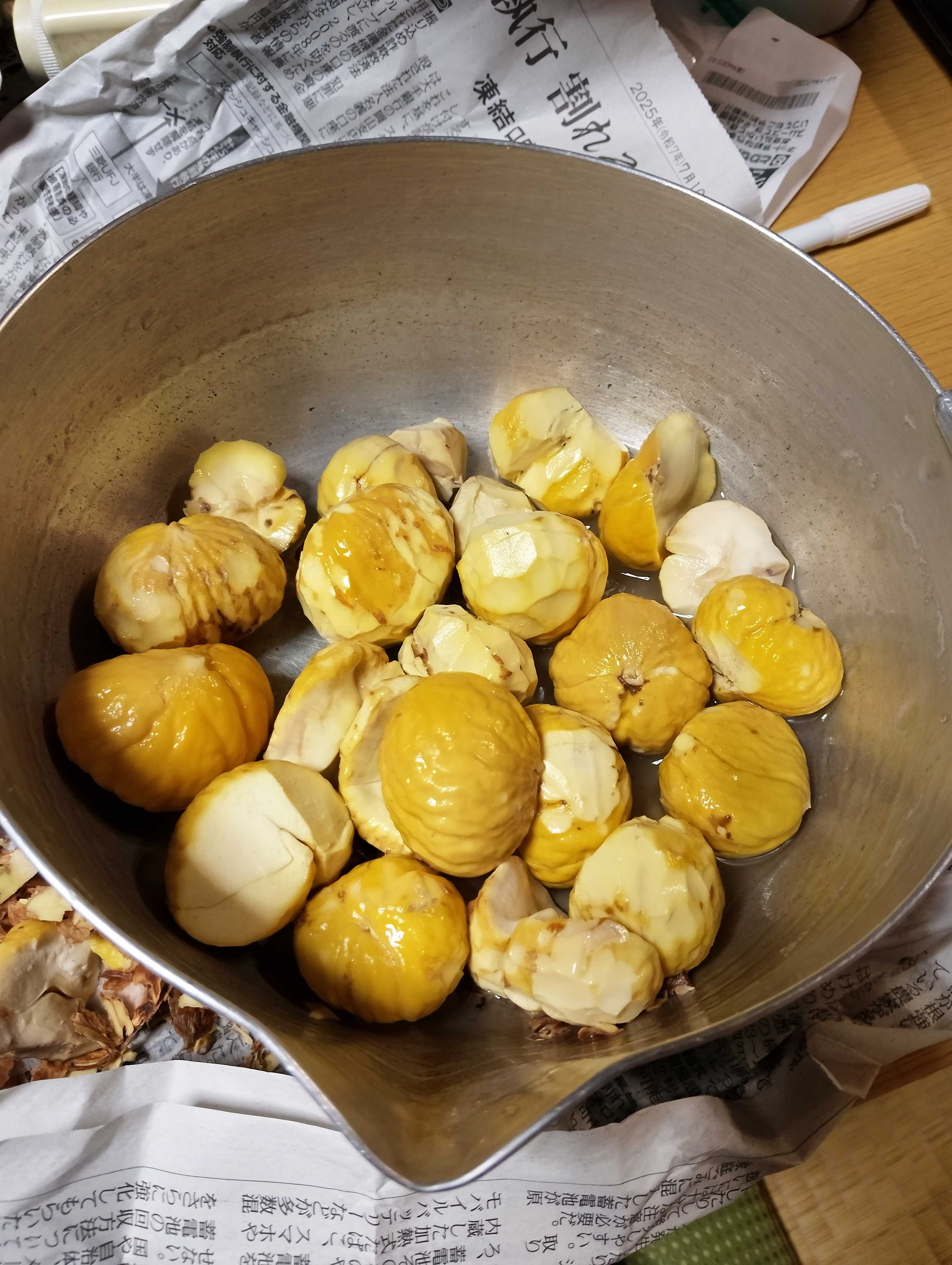 秋ですね~🍁栗の季節がやってまいりましたこのブログ始めてから何回目の栗むきでしょうか?今回は、一度試したことのある冷凍むき一度冷凍してから熱湯に10分くらい漬けて、鬼皮を剥く続いて渋皮をむく前回はあまりうまくいかず、結局包丁でむいてしまったのですが、今回はちょっといい感じでした😊鬼皮はふやけているので、栗むき器で楽々剥けましたなぜ包丁でなく、栗むき器なのかというと、中指の付け根が痛くて、ばね指っぽいのです😭いよいよ栗も剥けないかな…と思っていたのですが、とりあえず鬼皮は無事剥けました次は渋皮栗の甘露煮を作りたいので、渋皮は剥かないといけませんするとですね、渋皮もふやけていて、爪でペロリと剥けていくではないですか❗️なんといいますか、ゆで卵の皮むきの感じに似ています何個かは剥きづらいものもありました虫食いなのか、色が変色してるのもありましたし、そういうのはカットして、食べられそうなところだけ残します包丁で剥かなかったので、栗のサイズは大きめ、手も痛くならなかったです❗️良かった、これならまだまだ栗、剥けます😂❗️お友達の庭で採れた栗で、大きくてツヤツヤ新鮮、毎年くださるので、これからも美味しくいただきたいものです😊💞まだたくさん冷凍してあるので、次は栗ご飯かな🌰