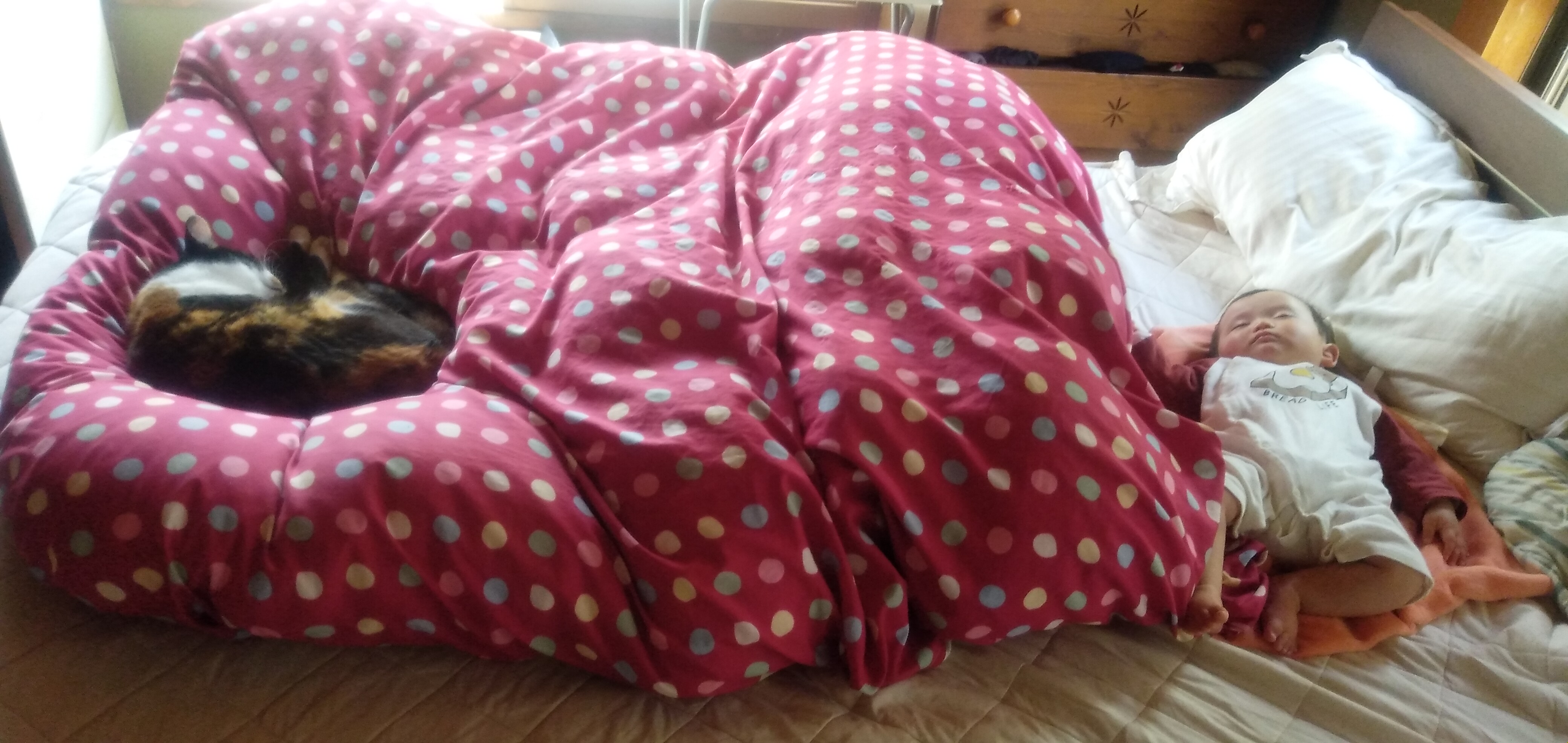 めっきり寒くなりました。今年はずっと暑かったので、急に寒くなって体がついて行けません。そうかと思うと突然暑くなったり…今年はもう暑くならないでしょうね😳❗❓ぽぽにゃんもどこか暖かい場所を探してゴロゴロしています日差しが入る、わたしの膝の上も大好き😊💞💞夏には私に寄り付きもせず、涼しいところを探してましたけどね。もう何年にもなるくまのプーさんのぬいぐるみもお気に入りです😊💞ふみふみ体操するのもプーさんの上。最近は古くなったので赤や黄色のぽわぽわな綿毛が良く落ちています。そして最近発見したぽぽにゃんの憩いの場所は…赤ちゃんの座布団😳❗いつもは赤ちゃんが寝てるのに、隙を見てちゃっかり寝てたのにはびっくり。赤ちゃんが卒業したらもらおうね~😄❗昔は小春日和の暖かい秋がしばらく続いてから冬になるのに最近は暑い~から寒い~で間がないので寂しい😵そろそろコタツを出そうかな❓