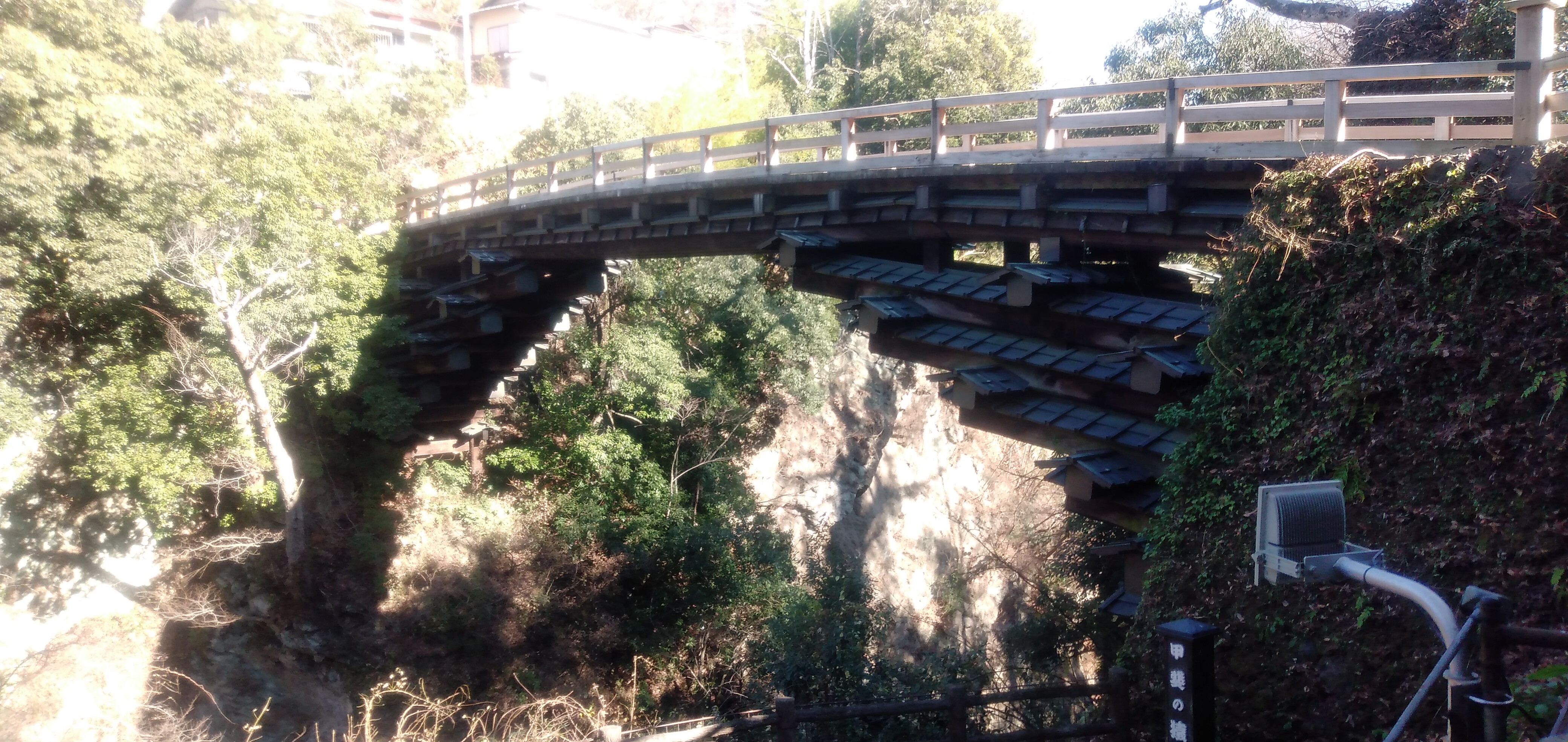 お正月、セカンドハウスに行く途中、山梨県の猿橋に寄りました。日本三大奇橋の一つといわれ、猿が連なって川を渡る姿にヒントを得て造られたらしいです。ゆっくり見るのは2回目、前回が昔すぎて良く覚えていません。こじんまりとした橋です。改めて見てみるとやはり風情のある橋ですね。橋を支える木に小さい屋根がついているのがかわいい😄✨広重の浮世絵にも描かれていますが、川に沿って下っていくと、同じ構図で橋を見上げることができます。また、橋の上から渓谷を見下ろすと、迫力のある渓谷美を堪能できます。結構高さがあるので、足がすくむ💦💦向かいの新しい橋から猿橋を見ることもできます。こちらの角度からの眺めもまた、なかなか…近くには公園もあるので、時間があれば、ちょうどいい散歩コースになります😄あちらこちらから見ることができて楽しい猿橋。橋の麓のおそば屋さんは残念ながらお正月中は閉まっていました。また、春に訪れるのも良いかもです😄🎶