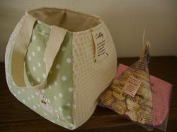 このバックお財布・携帯・ハンカチ・テッシュを入れて持ち歩く位の小さなサイズでコロンとした丸い形が可愛いんです。お色も春らしいパステル調で可愛い小鳥のアップリケが付いているんです。お天気の良い日にこれを持って何処にお散歩しようかしら?と思わせてくれるような愛らしいバックでした♪