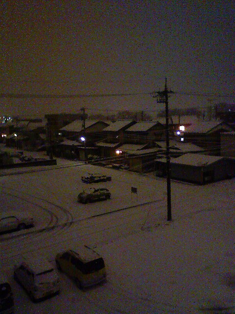 今晩出張で福井に入った。昼過ぎまでは東京にいて、得意先に訪問したのだが、全く穏やかな天気。駅から現地まで、荷物を持って走ったので、少し汗ばむくらいだった。マッペイはさほど寒がりではないので、当然コートは必要なし。そのまま東京駅に向かって新幹線で福井へ向かう。で、ビックリ!!福井駅に降り立ったら、一面雪景色ではないか!!気温もぐっと低いし、みんなコート着てるし・・・駅で迎えの車を待つのも、マッペイ一人だけ防寒準備ゼロで、何だか情けなかった(T-T)。何でも今年は暖冬で、ほとんど降っていなかったのが、昨晩から降り出したらしい。会社の窓から見た、雪景色↓夜だから、写真が暗い(T-T)。まあ、おかげで今週~来週末は、スキーにいけるかな(⌒ー⌒) 。