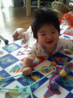 おはようございます今日はなかなかいい天気ですね♪昨日、コータが初ハイハイしました!!!今まで、腹ばいでお腹を上げたり大人が背筋鍛えるときみたいな姿勢したり、足を蹴りけりとかの自主練(笑)はよくしてたのですが。それらすべてがうまく融合して昨日初ハイハイんで、今朝ももうあちこちおもちゃじゃないものを触ろうと必死になってハイハイしてます(爆)子供って何であんなにおもちゃじゃないものが好きなんですかね?コータン最近のお気に入りは1位ちらし2位紙おむつの袋(スーパーの袋)3位ハンガーです。それを触って遊ぶためにプレイマットのすみからすみまで移動し、床の上に移り、やっとちらしを手に入れてご満悦(笑)それから。11月5日が結婚式をやった日なので、昨日夕飯を食べに行きました。レストランウエディングだったんですが。そこの社長にほれてそこでやったような感じです。自分のことを『池田(店のある所の地名です)のじいじ』と言い、社長自らコータを抱っこしててくれるのでいつもパパと二人でゆっくりご飯♪できちゃいます。ところが。。。昨日「ほらじいじのとこ行っといで♪」と社長にコータを抱っこしてもらいコータにこにこで消えてったその20分位後。大泣きでひっくひっく言いながらコータ帰ってきました。社長苦笑い。(笑)あたしはそのコータを見て爆笑してしまいました。だってあんまりにも「赤ちゃん」で可愛かったんで。どうやら人見知りっぽい感じのものが始まったようです。社長、がっかりして悔しがってました(笑)で、あたしが抱っこして落ち着いた様子。落ち着いたみたいなんで社長にもっかい抱っこしてもらってみたら口がゆがんで泣き出しそうな顔(笑)あわててパパに抱っこを代わったらパパだと泣かない。それに又悔しがる社長(爆)パパのことは分かるんだね☆☆とびっくり。カナリご機嫌になった帰りに最後のチャレンジで抱っこで車まで行き、コータがニコニコだったことに安心して「又おいでね(^▽^)」と両手を振って見送ってくれました。おいしいご飯がゆっくり食べれていい日だった♪
