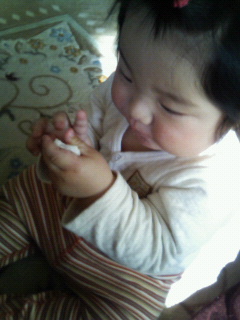 自分でもって食べるのがすっかり楽しいコータです。前歯でしゃくしゃくいわせて一生懸命食べてます。ごはんもたくさん食べます。でもおっぱいもまだまだ大好き♪そして立派な前歯であたしのおっぱいをがぶりとやってくれます痛ぁぁい(><)とあたしが騒げばにやりたくらみ顔で口を開くのであります。。。そういえば。あたしのお友達が2人もにんぷちゃんです1人は去年の今頃、あたしがまだにんぷちゃんだった頃結婚式を挙げたお友達。もう1人は。今度の4月。ちょうどコータが1歳ちょい前。に結婚式を挙げることになりました。2人ともだいたい8月9月頃の予定(^▽^)コータのお友達が続々増えるなぁ♪と今からわくわくなのです(^皿^)あたしも次のチビちゃんを授かりたいなぁ(▽)と思っていますが。こればっかりは。思ったようにも行かないもので。。。でもでも。35歳までに3人は産みたいので。今から体力つけて、にんぷちゃんになったとき体重オーバーするかも。ってのを考えてちょっとダイエットしたりなんかして、備えておこうと思うのです今週の土曜に恒例の助産院で検診があります。おっぱいもよく飲むし、ごはんもよく食べるしおせんべいもなかなか食べてるのですが家中を はいはい しまくってそこらじゅうでつかまり立ちをし、あれこれ触って 遊び狂っているからなのかすっかりスリムになってきました。見た目でも分かるし。抱っこしても超軽ぅぅい(>▽<)ノので。あたしは喜んでおります♪一体どれくらいスマートさんになったのか。体重はかってもらうのが今からとってもタノシミ♪♪再来週には9ヶ月の歯の検診というのがあるそうで。(市で)歯ブラシもってきてね~と。はがきが届きましたので、行くのがタノシミです。歯ブラシ。買いましたよ。実はあたし。今ものっすごい虫歯だらけです(TT)歯医者に通ってるのですが。妊娠したとき甘く見てたので、歯がカナリぼろぼろ。さらになかなか行けなくて(行く時間もなかったし行くのも やだった)虫歯進行しまくってるんです (T▽T) タハハなので。コータさんの歯は。母ちゃんが守ってやるからね!!と。いつになく真剣です。後あたしがものっすごぉっぉい目が悪いので是非目のいい子に育ってほしい。風呂大好きっ子ですお風呂はすっかりパパのお仕事になりました。最初は全くできなかったのに。すっかり上手です。たまにあたしが頭とか洗うと普段やりなれてない上にあたしものすごい 大雑把な性格なんで(^▽^;)パパがコータに「パパが良いって言っていいんだヨォ(^皿^)」とか嬉しそうに声をかけてます(爆)しかし。パパが帰ってくるとパパのとこにハイハイしていく辺りなかなか分かってるんだなぁとしみじみ思います。まだ「バイバイ」できないんだけどね最近昼に何時間か続けてやっと寝れるようになってくれたのでこの時間があたしの休憩時間です。PCやってみたり。夕飯の仕込みしたり。片付け。掃除。等等たまには一緒に寝てみたり。。。んなことしてる内にコータが起きます。おはよう怪獣さんの瞬間ですまだ今日は寝たばっかだから大丈夫日記書いて。オトモダチのとこも覗きに行ってこよ♪