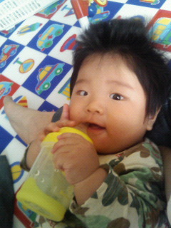 おはようございます最近やっと秋?冬?らしくなってきましたね(^▽^)たくさんお洋服が着れるし、コータにも色々着せれるので、楽しいですさて、題名どおり。始めました。離乳食5ヶ月と2日目に、ちょうど三種混合の一回目をしに行きました。んで、先生に「そろそろかなぁ。と思いつつ、世の中は最近アレルギーとかのこととかで遅めになってるけど、コータは体もでかいし、やってることかも結構早めだからどうかな?」て聞いたら、「はじめたらいいんじゃない?コーちゃん発達も2~3ヶ月先行ってる感じだし(爆)」と言われたんで、んじゃはじめよか。と翌日から始めました。あたしの中で、離乳食って一生関わってくる『食べる』てことの一番最初ですごい大事なとこって思うんで、じっくり。のんびり。楽しくやります♪10倍かゆを作って、それをさらに薄くして、あげてますが、なかなか上手にゴックンします。スプーンを持ったあたしの手をつかんで自分に近づけたりご飯を見ると口をちゅくちゅくしてつば飲み込んだりしてます食いしん坊?(爆)ま、この1ヶ月はかゆだけで、とにかくゴックンの練習と思ってます♪なので時間を決めてあげてます。おっぱいとおっぱいの間の時間。とかではなく。もちょっとしたら又かえますが。初日、下痢気味でしたが、(ベビの便は皆ゆるゆるですが、さらにゆるゆるさらさら?ってことです。)電話で先生に「こんなん状態だけどどーすりゃい~?」て聞いたら「ひどくなったら連れておいで、そうだな10回とかになっちゃったら」て言われ、最高4回で、収まったのでよしです。しかし。10倍をさらに薄めたかゆたった1さじで下痢なんて。。。からだってすごい正直だね。ちなみに、完母でB.Fのかゆじゃなくてちゃんとご飯とかコメで作ったかゆをくれてる場合は下痢になってもあげたほうがいいんだってセンセに言われました。初めて知った!!!ま。こんな感じで、今日で11日目を迎えたコータのマンマ毎朝8時のあたしのお気に入りタイムです(^▽^)すっかりマグの達人です(笑)あたしとかパパがなにか飲んでるとコップに手を出します。大人が何か飲んでると、くちゅくちゅゴクン。マグを見つけても、くちゅくちゅゴクン。(笑)「これは飲む?食べる?ものだ」って分かってるんでしょうかね?しかし。。。食いしん坊っぽいな。やることといい、この写真も。。。あ!ちなみに。マグの中身は『白湯』オンリーです♪まだ他のものはあげたことないです。ま。そのうちにね(^▽^)すっかりカメラ目線で笑えます。ちなみに抱っこしてる男の子みたいなのはあたしです。髪のびるのスーパー早いのでこんなにのびました