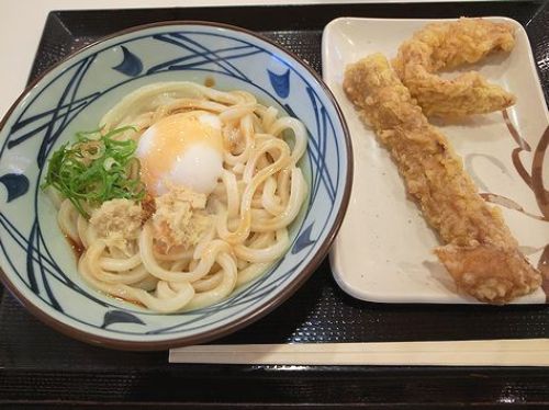 台風17号、関東は今夕~夜ぐらいから影響がでそうです。今夜のおかずは「コロッケ」でキマリですね。明日の朝までに抜けてくれるといいのですが・・・。さてさて、今日のエントリーは訳があって短めにまとめたいと思います。今日紹介するのは「丸亀製麺」で食べた「釜玉(並)」とサイドディッシュの天ぷらです。↑こんな感じの組み合わせです。釜玉の刻みネギとおろし生姜は自分で好みの量をトッピングしています。↑サイドディッシュの天ぷら2種です。見た目ですと同じモノで形がストレートかエルボーだけの違いに見えますが、まっすぐの方は「ちくわ天」、曲がっている方は「かしわ天(鶏)」です。1個の値段はいずれも100円です。塩だけで食べてもOKですが、今回は「釜玉」のだし醤油をつけていただきました。↑まぜまぜする前の「釜玉(並)」(330円)です。玉子は「温泉玉子」を選んでみました。いつも「だし醤油」をかけ過ぎて失敗してしまうので、今回はかける量を抑え目にしています。あまり美しい画像とは言えませんが、↑コチラは混ぜた後の状態です。うどんは熱々の状態ですが、熱で玉子が固まってしまわずによく絡んでいます。これに粉チーズをかければ「うどんカルボナーラ」に変身しますが、私はこのまま食べるのが好きです。たまに食べたくなる「釜玉」・・・今回も美味しくいただくことができました。今日のエントリーは以上です。