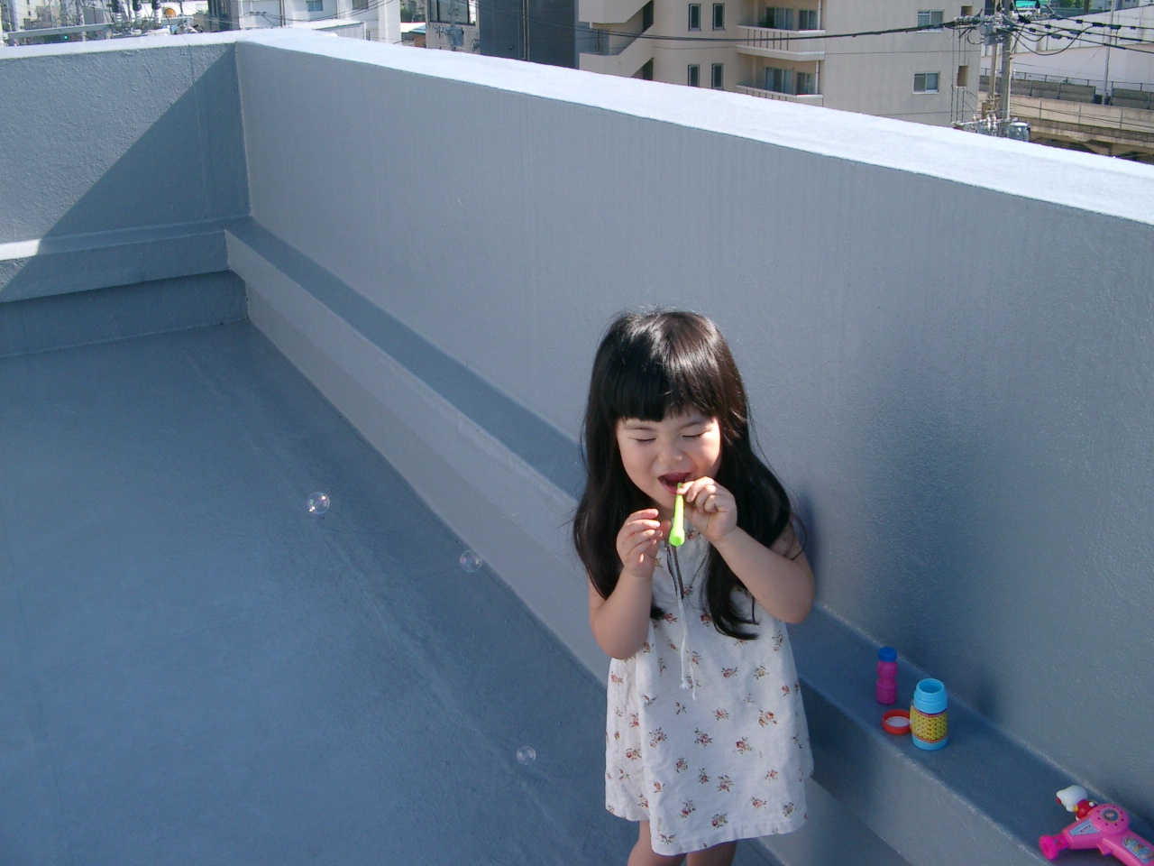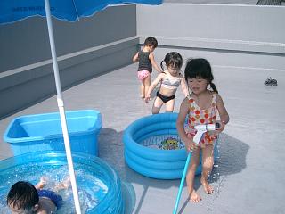 毎日暑いですね我が家は相変わらずエアコン無しが続いてます夜も暑くて何度も目が覚め、夏は顔も体もあせもだらけ・・・あんまり可愛そうなので夜はこっそり家族で3Fに移住します(賃貸用のお部屋が空いてるので)明日にはエアコンの見積もりが出るのであと少しの我慢です・・・昼間は屋上で水遊びをしてます蛇口が屋上まで引いてなかったので出来ないかな?って思ったけどホースで十分でしたでもこの暑さであっという間にプールが露天風呂へと変貌しますそんなプールで良かったらみなさん遊びに来て下さいね**********************************************+++ お知らせ +++25日に引越しパーティーをしようと計画してますお昼過ぎから屋上で子供たちは水遊び大人はBBQ&ビアガーデンで楽しみたいと思ってます参加出来る方はメールにて連絡下さいお子さん、旦那さんもよければご一緒にみなさんぜひ遊びに来て下さいね*