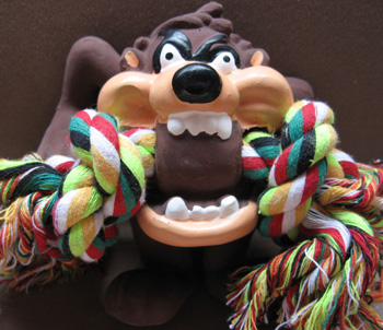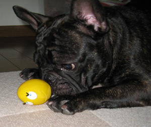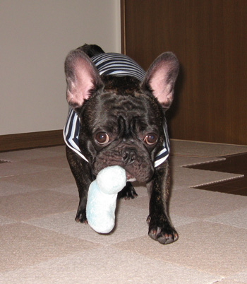 マリオが一番好きなおもちゃはこれですゴムで出来たブルドッグにコットンロープが付いていて音も出ます。実はこれは2代目なんです1代目がボロボロになってしまったので再度購入しました 元々、強面なブルドッグの顔がボロボロになって余計に怖いかも・・・約4ヶ月間、遊んだらこんな状態になりました2代目のおもちゃをくわえて部屋の中を走り回っているマリオです私に突進して来ます 大抵のおもちゃはマリオが気に入っていてもすぐに壊れるものばかりですがこのおもちゃは優秀です840円で4ヶ月持つのならば格安です