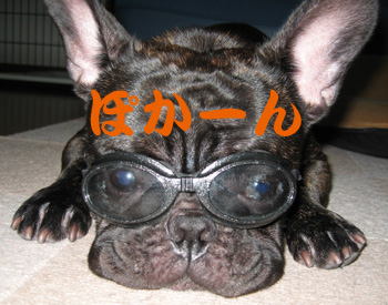 パピーの頃に買ったDogglesを久々に装着してみましたおとなしくしてるかと思いきや、かなり嫌がってますっフレームのサイズは大丈夫なんだけどゴムがきつくなっていたのでもう使えないです・・・しばらくそのままの状態で何枚も写真を撮っているとマリオがこんな表情に・・・マリオかなり怒ってます
