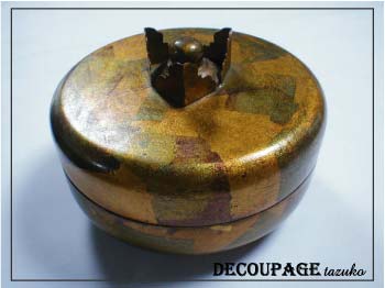 今日ご紹介するマリリンのお気に入りは母の手作りの蒔絵風小物入れです マリリンのお気に入り 母の手作りシリーズ デコパージュの蒔絵風小物入れいろいろな色合いの金箔を使ってとても凝った作りに仕上げてあります。母の一番のお気に入りの作品ですつまみ部分も母のアイデアですばらしい出来上がりです。足も丸い足が3個いい感じですね。+++ 蒔絵の小物をインテリアに! +++ お気に入りが見つかったら写真を してね。お店に行くよ