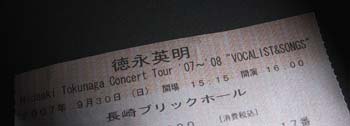 9/30(日)に大好きな徳永英明さんのコンサートHideaki Tokunaga Concert Tour’07~’08「VOCALIST&SONGS」に行ってきました maririnn*はホールでのコンサート初体験!会場は長崎ブリックホール、残念な事に座席はB席2階の一番後ろの真ん中大好きな徳永さんの顔はもちろん見えませんでも、チケットは即日完売だったそうなので、取れただけでもラッキーですコンサートは徳永さんのオリジナル曲と今ヒットしている女性ヴォーカル曲をカヴァーしたアルバム「VOCALIST」の中の曲を中心に2時間色んな曲を聴けて大満足でしたmaririnn*は1曲目「ハナミズキ」の徳永さんの歌声を聞いたとたん感動で目がウルウルあの透明感のあるハスキーで甘い歌声に完全に酔いしれしまいました声量もすごく、ホールいっぱいに響いてました。カバー曲はどれも素晴らしく完全に徳永さんの曲になっていて特に「恋におちて」と「会いたい」の熱唱はすごかった~そしてオリジナルの「壊れかけのRadio」前奏曲が鳴り出しただけでもmaririnn*は鳥肌が立ってしまいました。やっぱりこれが最高(^o^)丿幸せな時間はあっと過ぎ、夢の中にいるような maririnn*はなかなか夢から覚めずしばらくボーとしてました