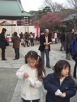 近くのお寺の豆まきに初めて行ってみたたくさん人がいて危険そうだったので正面はやめて子供達がたくさんいるゾーンへここは柵で囲まれていて安全最後に子供だけ手渡しで豆の入った袋をもらうシステムなので、豆まきは正面だけでしたその様子をみていると帽子を広げてる人、手を伸ばしてる人こっちこっちと身振り手振りでみんな必死豆まきが終わった後みんな豆の袋から豆を取り出して何か探してる様子後で分かったその理由景品交換所のテントを発見デパートの名前とかも書いてあったし商品券っぽい包みを受取ってた人がいたのでかなりいい景品が当たるのかも~夜は手巻きにして好きなものを巻いて食べるKAZ何を巻いてるのかと思ったら大根のけん(つま)だけを巻いてかぶりつきみんな夢中で食べてたので東北東を向いて丸かぶりをすっかり忘れてました恵方巻きの豆知識というのを見つけました恵方巻きがこう食べる!1・恵方(2009年は東北東)を向いて、願い事を思い浮かべながら。 2・途中でやめず、一気に食べ切る! 3・食べている間は終始無言で!黙々と