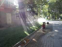 昨日記事に書いた散水機が朝のすがすがしい空気の中に霧のような水を撒いて、美しい光景です♪
