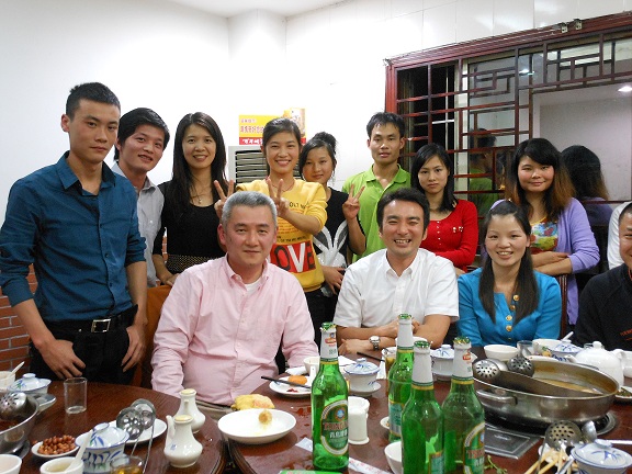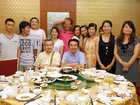 25日は、中国工場引っ越しの慰労会という名目で 観蘭にあるちょっと高級な中華料理のお店に社長はじめ スタッフ全員で行って来ました。 (僕は引っ越しには参加していないので、おまけですが・・・) 車1台では乗れないので、ローカルバスで行って現地集合と言う事に。 社長と総務の職員と僕の3人でバス停まで歩き、2元バスに。 座席は埋まっていて、数人が立っていました。 我々もバスの中央部まで行き、吊革につかまっていると、1人の若者が 僕の腕を、トントンと、振り返ると彼は座席から立ち上がって僕に席を 譲ってくれているのです。 (こちらでは、年配の人を大切にする習慣があり、共用の乗り物などでは、 席を譲る、あるいはドライバーが席を譲るようマイクでアナウンスする ということを、聞いていました。) えーっ!まさかーっ、ぼくにー? 手と顔を横に振り、ジェスチャーで遠慮していると、社長が 『Gさん、座った方がいいよ~、』と・・・ まだまだ若いつもりでいたんですが、世間的にみるともう、年配組の 仲間入りしているのでしょうか・・・。 まっ、その後の慰労会は、楽しませていただきました。 社長とも話しましたが、気が付けば我がTOCHOもそれなりの大世帯に なっていました。 最後に記念撮影。 では、またブログでお逢いしましょう。 製造部 G・・・でした。