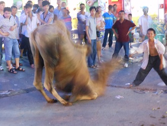 僕がこちらへ来ている時は、いつも、少し残業をさせているのですが、 今回も、約2時間の残業をさせています。 そのお蔭か、今日、帰りのバスを降りて宿舎までの15分の道のりを 歩いていると、黒山の人だかり。 その人だかりから、頭二つ飛び出していたのが、『ラクダ』の顔です。 初めは、着ぐるみかと思いましたが、近づいてみると本物の 2コブラクダが、横たわっていました。 そのラクダの前で、おじさんが地面に頭をこすり付けているという、 奇妙な光景に出くわしました。 そのまま、宿舎に向かって歩くと、宿舎の前にもまた、2コブラクダが。 ラクダ使いの様な人が言う事を効かないラクダに悪戦している様子。 動物園でもなかなか見られない光景に、すこしビックリしましたが、 いい土産話が、出来ました。 では、またブログでお逢いしましょう。 製造部 G・・・でした。