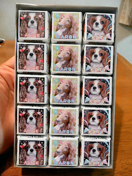 今年の1月、ネットの懸賞で“DECOチョコ”を作る無料クーポンが当たってまして息子の受験でなんやかんやでバタバタしててず~~~~~っと放置してました今さら、もう期限切れでクーポンが使えないかもしれない・・・と思いながらもDEKOチョコが作りたい一心で写真を選んで、デザインを決めて・・・注文とりあえず無料クーポンで受け付けてもらえました~そのDECOチョコが届きました~♪チロルチョコの包み紙にマロン・アリス・ケイティの写真入りですミルク味です食べたいな~~。 でも、もったいないな~~。気になって毎日見てるけど、とりあえず1個も食べず、いまだに冷蔵庫の中に入ってま~す食べた後の包み紙はチロルチョコ型のマグネットやストラップがあるのでそれに付ける事ができるみたいです捨てるのは絶対にイヤですからねぇ~それから近々アリスがついに避妊手術を予定してます。健康な体に全身麻酔してメスをいれて・・・本当に良いのか?!マロンの時と同様、すごく悩んだけど高齢になると病気の発生率が高くなるので決断しました。マロンの時も心配でしたが1度耳の怪我で麻酔をした事があったので大丈夫だという気持ちがありでもアリスは今まで麻酔というのをした事がないのでものすごく心配ですキャバリアは特に麻酔が心臓に悪い??か、何か聞いたような??どうなんだろう~そこんとこ、明日病院へ行ってよ~~く話を聞いてみようと思ってます。 わたし、がんばるよ!!