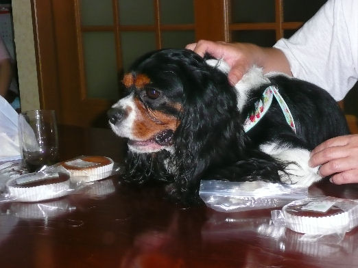 7月26日 大雨 久留米へオフ会に行ってきました~店長さんの自宅でのオフ会だったので7キャバちゃんがいましたよ~ ハルくん。 カイくん。メイちゃん・エルちゃん・・・・・ あ~~、みんな覚えたつもりだったのにぃ~~、ごめんなさい 他のキャバちゃんたちも沢山来てました~。 ナナちゃん。 レディちゃん・アンナちゃん姉妹。ルビっ子ちゃんたち、可愛い~~ エルフちゃん。 健太郎くん。リラックス~~ 気持ち良さそうなお顔~~。 ママさんに抱っこされてるシェリちゃん。(エルフちゃんの娘さん) シンちゃん。(ケイティはシンちゃんが気になります) ショパンくん。(イケメンはモテます!!) BUBUくん。 フィガロくん。 キャロルちゃん。(フィガロくんの妹さん) マロンちゃん。 リンちゃん。あとレオンくんが居たんですが動きが激速すぎて写真がブレブレ~次回は頑張ります!!テーブルに料理が運ばれてくるとキャバちゃんたちはワイワイご馳走で~す 美味しそう~~ あら? 飼い主さんたちにアリスが仲間入り?? 実はチキンの丸焼きがアリスの目の前に置いてあるのです。食いしん坊アリスはガン見してま~すやれやれ、チキンが大好きなコマッタちゃんですシンちゃんのパパさんがワンコ用の手作りケーキをだしてくださいました~。BUBUくん、美味しそうに食べてます。アリスとケイティにも。 いっただきま~す♪♪一気にペロリ~でしたそれからオーダーしてたアリスのスヌードが出来上がってたので早速、アリスに装着~。 どうかしらん?健ママさん、可愛いスヌードありがとうございますこれから大活躍しそうです沢山のキャバちゃんに会えてとても楽しい オフ会でした~店長さん、健ママさん、キョウさん、シンままさん、ナナちゃんのママさん、パパさん達、ありがとうございました~最後にパピコのアンナちゃんのお顔が見えてなかったので、ど~ぞ♪きゃ~、可愛い~~~ 可愛すぎるぅ~~ケイティがまたパピコに戻ってくれないかな~~