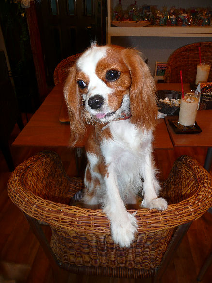 昨日はキャバ友達のシンちゃんと待望のデートをしちゃいました~シンちゃんです。 頭のトサカがかっこいいイケメンなのですよ~シンままさん、すごい大雨だったのに遠くから来ていただいてありがとうございました~場所はNEWOPENしたばかりの“ジャネット”。看板犬には何とキャバちゃんがいました~手前がこうめちゃん(6歳) 奥がうめちゃん(10歳)です。おばあちゃんとお孫さんだそうで~す。うめちゃんが寝てるベット、写真には全体が写ってないけど姫系でかわいい♪他にお客さんがいなかったのでノーリードで店内をウロウロアリスもケイティもうめちゃん・こうめちゃんにご挨拶に行ってました~。ケイティはご挨拶と言うよりもただ近づいただけですが・・・ランチにはチーズカレーセットを注文。チーズがたくさん入ってて美味しかったですシンままさんと話もはずみ、そしてシンままさんからすごいニュースがな・なんとシンちゃんとアリスが親戚さんだとうわぁ~~すごい!! とても嬉しい~~早速、親戚さん同士でパチリ。ケイティはシンちゃんが大好きらしくシンちゃんにくっついてばかりいました~ シンおにいちゃん、すきでしゅ~ シンおにいちゃん~~~ケイティがしつこくしてごめんね私達、ママさんの食事も終わりキャバ達のおやつタイムが始まりました~ おやつ、おやつ、おやつ~~~♪きゃ~~、その見つめる瞳がたまりません!! みんな可愛すぎますシンままさんからもおやつを・・・。シンちゃんとケイティはお利口にして待ってます。 えらいぞ~☆アリスは・・・イスの上で待ってますシンままさんがやさしいことを知ってるのか一生懸命にもらいに行かなくてもここで待ってれば貰えると・・・。怠慢だ~~!!もっと動いておくれぇ~~ (アリスはまた太ってきてます)シンままさん、シンちゃん、楽しいデート、ありがとうございました~また、デートしてくださいねそしてアリママブランドのバッグも褒めていただいてありがとうございました☆バージョンアップしてブログに登場させたいと思います