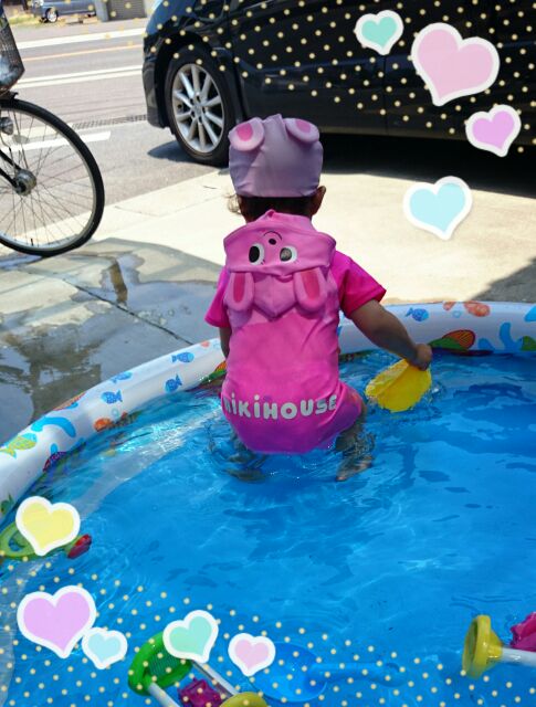 今日でお盆休みが終わってしまいます 主人の実家に帰ったりアンパンマンミュージアムに行ったり、水族館に行ったりとお出かけ満載のお盆休みでした 着画がたまりまくっているので、少しずつアップします こちらは私のおばあちゃん、娘から見るとひいおばあちゃんのお家でプールをしたときの写真です なぜかへっぴり腰です… こちらは主人の実家にてプールをしたときです 主人の実家にはプールがなかったので我が家のものを持参しました 以前、お買い物マラソンで購入していたプールですが、水を入れると噴水のように水が出てくるタイプで、娘は大興奮でした 水着と水泳キャップはミキハウスのなりきりうさこちゃんです これを着て登場すると親戚の皆から「かわいい~」と絶賛の嵐でした笑 お出かけたくさんで疲れているので今日は家でゆっくり休んでいます