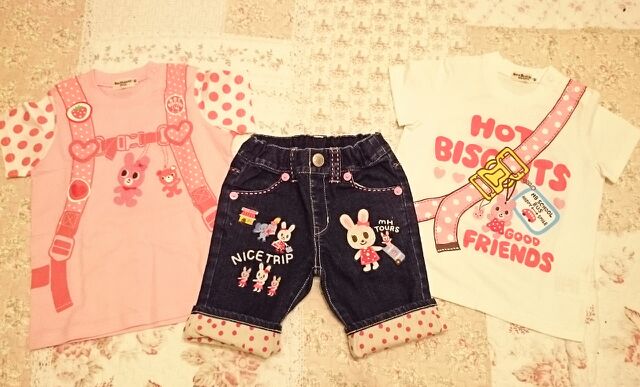 ミキハウスのサマーパックに翻弄されております マジックファクトリーさんのサマーパック、リベンジしましたがカゴには入れられたもののその後もたついたせいで購入出来ませんでした そんなこんなしてるうちにダイワさんで夏の福袋発売 となっていてがっくりです しかし懲りずにあかちゃんぱぁくさんのサマーパックの再販を狙います さてしばらく更新をしていなかった期間に購入した商品をアップします まずはホットビ祭りです サイズは全て90です 娘の保育園着として大活躍しております 娘はアイスを持ったキャビネットちゃんのTシャツが一番お気に入りです つづいてこちら うさこのジェラートTシャツにトラベルパンツ可愛いです フリルパンツはグレーを持っていましたが、ヘビロテ中なので色違いのブラック購入です 着画もアップしていきたいです