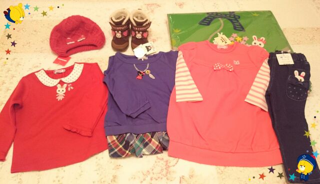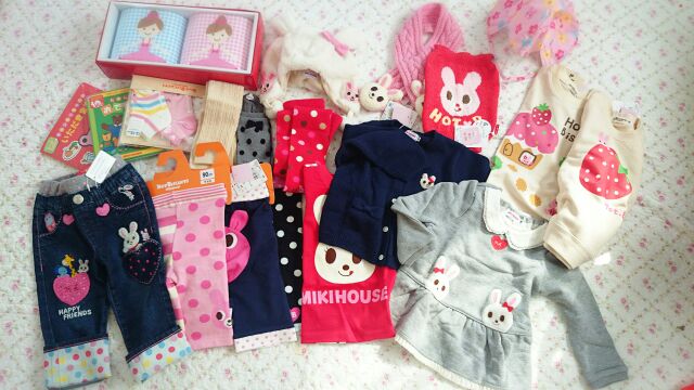 おはようございます 昨日参加してきたミキハウスランドの戦利品をアップしたいと思います その前に、昨日参加された皆さま本当にお疲れ様でした 全体的にお品ものの数が少なくダブルBなんて一点も見かけられず… 靴も17cmくらいの大きなサイズからしか売っておらず、靴をゲット出来るんではないかと楽しみにしていただけに残念でした 激戦90サイズも本当に激戦で、クタクタになりした ですが、たくさんの人とお話することが出来、色々教えて頂いたり、交換したり、と楽しくお見分けすることが出来ました この場を借りて昨日、お世話になった皆さま本当にありがとうございました、とお礼をお伝えしたいと思います それでは戦利品です まずはB品コーナー \じゃーーーん!/ どうでしょうか 自分的お宝はうさこちゃんのグレーのチュニックと紺のカーディガン、豪華デニムです この会場にはおそらくこの一点くらいしか無かったのではないでしょうか…? あとは保育園用のホットビのパンツやTシャツなどがメインです 小物もちょこちょこゲット出来ました こちらは30%OFFのコーナーで購入したものです 定価でも欲しいもの!を基準にレギンスや肌着などを購入しました お値段や詳細についてはまた時間を見つけてアップしたいと思います
