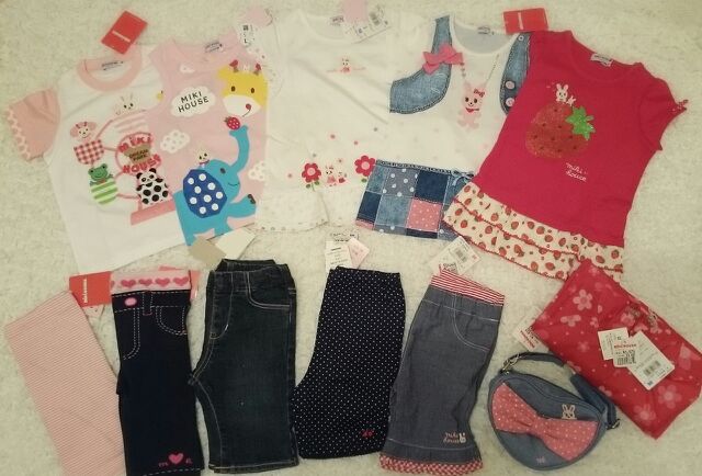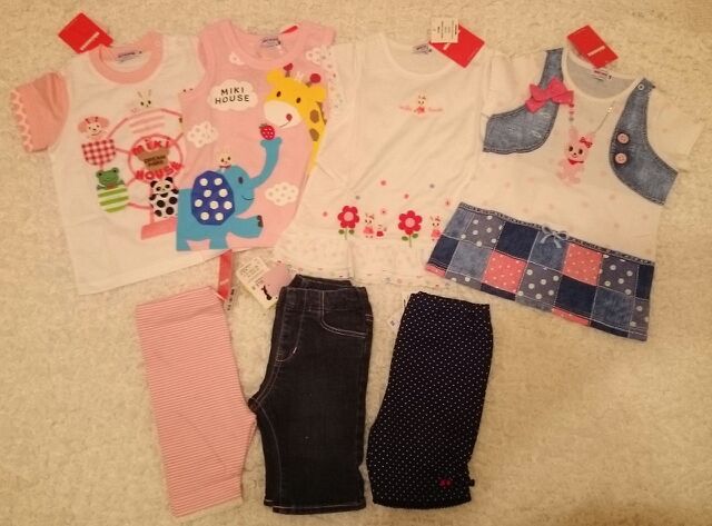今日はミキハウスランドin福岡に参戦して参りました簡単にですがレポしたいと思います今日は朝から娘の入園式があり、その後担任の先生からの挨拶やお話し、個人面談があり気が付いたときにはもうお昼前バタバタ家に帰って着替えて軽く腹ごしらえをして会場へ出発会場に着いたのは1時前でした車を停めていると会場からたくさんの荷物を抱えた人達が嬉しそうに帰って行くのが見えましたうらやましいです正直もう何もないだろうな~、とかなり諦め気分で会場へ入り、現金お買い上げコーナーの90サイズワゴンへもう、ものの見事にすっからかんでしたあるのはタイツとボトムが2つほど。お見分け台も人がまばらで物も少ないのですが、ショップ袋を5つも6つも持ってお見分けしてる方が何人かいたので、もしかしたらあとでお見分け台に良いのが置かれているかもと淡い期待を抱き、とりあえずは30%オフのコーナーに行きました30%オフコーナーで欲しいものをいくつか袋に入れてまた現金お買い上げコーナーへワゴンやお見分け台をそれはもうぐるぐると回って欲しいものを探しました 今思うとハイエナのようだったと思います優しい方がお見分けした品ものを譲って下さったり、二時間近くハイエナのようにうろついた結果の戦利品写真がこちらです現金お買い上げコーナー&30%オフでゲットしたもの全てです遅く行った割には可愛いお洋服がゲット出来たように思います自分的にはかなり満足の行くお買い物が出来ました簡単に書くつもりがまたまた長くなってしまったので次のブログで戦利品の詳細をアップしたいと思います