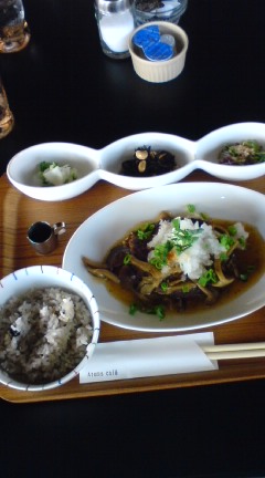 今日はランチに行って来ました。明日でお仕事終了の同僚の「お別れランチ」です。行った所は ATOMS CAFE (名前あってるかな)なかなか雰囲気があって良かったです。穏やか~な時間が流れてるって感じ。。。そして、食べた物はーーー週替りランチ880円なり~雑穀米、和風ハンバーグ、お漬物、ひじきと煮豆、水菜と菊なかなかでしたそして、お待ちかねデザートです~上のクリームはYさんが好きではないということで、頂いちゃいましたラッキーこのとろ~りプリン、とっても美味しくて幸せになっちゃった今度は旦那様と行ってみたいなーと思いました。。。Designed By チワワン子