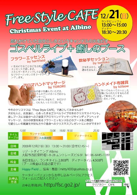 こんばんは♪ 街が、華やかなクリスマスムードにつつまれてきましたね。 うちでは、母が、夜間の安全のため・・・という理由で(笑)、 家の前に、4色のLEDイルミネーションをピカピカさせています☆ とても美しい♪ さてさて、12月21日(日)クリスマスイベントのお誘いです♪ 美味しい食事を楽しみながら、 癒しのブースや、ゴスペルライヴを楽しむクリスマスイベントはいかがですか♪ わたくし、tomokoは、【数秘のセッション】で、出展させていただきます。 数秘、大好きです。 生年月日の数字、一つ一つに意味があります。 自分の数秘を知って、中心を知ってほしいなぁ♪ 大好きなパワーストーンも、実物を手にとってもらえるように、 はしっこに(笑)、展示させていただきます♪ 今年のクリスマス、どんな出会いが待っているのかしら♪ 明るい癒しのクリスマスをご希望のかた、ぜひ一緒に楽しみましょう♪ 『Free Style CAFE』Christmas EVENT at Albino お肌だけでなくココロも癒すアロマハンドマッサージ♪ お一人おひとりに必要なエッセンスをリーディングするフラワーエッセンス☆ 生年月日からアナタの使命をお伝えする、 数秘セッション♪数字の不思議体験をアナタに♪ そんな癒しの空間をご用意☆ ブースで癒やされた後は、 ゴスペルを聞きながらアルビノ特製のお料理をお楽しみください! とっても可愛い布雑貨の販売もございます。 思わず笑顔になりココロがほころぶ優しい雑貨達… お友達やご自身へのクリスマスプレゼントにいかがですか? 『Free Style CAFE』Christmas EVENT at Albino 日時:2008年12月21日(日) 13:00~21:00 受付12:45~ ランチタイム 13:00~15:00 ディナータイム 18:30~20:30 ブース開催時間 13:00~18:00 場所:リゾートダイニング Albino(アルビノ) http://www.albino.co.jp/ 地下鉄御堂筋線 淀屋橋駅より徒歩10分 地下鉄四つ橋線 肥後橋駅より徒歩3分 ○お申込みは簡単!! 下記のお申込み専用フォームにアクセスし入力するだけ!! http://fsc.go2.jp/ 料金(当日支払い) ランチタイム お一人様2800円 ☆ビュッフェランチ&ワンドリンク ディナータイム お一人様4500円 ☆ディナー&フリードリンク (ビール、ワイン、カクテル等豊富にご用意♪) ディナータイムはスタッフも加わって一緒に楽しみます☆ ※ブースは別途料金要 ランチかディナーのいずれかをお選び頂けます。 もちろん!!両方もOKです♪ 忘れかけた自分らしさというキャンドルの火を灯してみませんか?お友達をお誘いの上、是非お越しください。 ご予約いただいた方に、優先特典& クリスマスプレゼントをご用意してお待ちしております☆ ○主催 HappyField... 担当:喜田みち子 (コーチングもなさる、とても明るく素敵な女性です♪) http://happyfield315.blog55.fc2.com/ ↑↑↑ イベント最新情報のってます♪ 皆さまのお越しを心よりお待ちしております♪ 音響チェックで、一緒に行ったスタッフさんがいうには、 ゴスペルも、すごいらしい。 そのときのゴスペル聖歌隊(クワイヤー)は、2人だったのだけど、 声の響きがただごとじゃないよう。 当日は、なんと8名です☆ ナイショで、曲目を紹介すると、 Silent Nighit ←クリスマスといえばコレ!! 「きよしこの夜」の英語版。 O Come All Ye Faithful ←う~ん、、、知らない(笑)☆ 当日をお楽しみに♪ Joyful Joyful ←天使にラブソングを2で有名になった曲ね♪ Joy To The World ←わたしの大好きな曲 「ジョジョジョ ジョイトゥザワッ☆」って 繰り返すノリのいい曲です♪ Glolia ←レイチャールズの映画「Ray」で知りました♪ いったん州を追われた黒人のレイチャールズが、 何年もたち、認められ、受け入れられて、 曲が、州歌になったいきさつの曲。 ・・・あっ、それはGloliaでなく、ジョージアだわ☆英語が読めない☆ ランチとディナーを楽しみながらの、ゴスペルライブです♪ それぞれのステージは5曲+1曲ずつ(うち1曲は違う曲)予定♪ ランチとディナーで、もう一曲ずつ秘密の曲があるらしい♪ わたしのリクエストとしては、 マライヤキャリーの「恋人たちのクリスマス」だわ♪ 「オールアイウォントふぉークリスマスいずYOU~~~」 あっ、でも、ビル・ウィザースの「Lean on me」もすてきなの♪ 「ぼくに寄りかかっていいよ。肩をかすよ。」って、曲。 USA for AFRICA の 「 We Are The World 」もいいな♪ これなら、みんなで、歌えるわ♪ もちろん、「ウィアーザわ~、ウィアーザちるどれん~」って、 サビが歌えれば、じゅうぶんよっ(笑) わたしもそこしか知りません☆ 「War is over」もいいわぁ~! クリスマス、楽しみね~♪