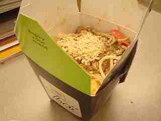 お約束のブツを♪金曜日のランチざんす。*Pad Thai*ライスヌードルの炒めたモン今回は、ベジタブル(野菜)を。いっぱい入ってたぞ~この私が二回に分けて食べたくらいなんだから!辛さも指定できて、「スパイシー」にしたけど・・・ホント辛かったっす。嫌味な辛さぢゃないんだけどね。何よりお持ち帰り用の容器がカワイイっしょ?!前の日に、「(ランチを)奮発しちゃおう~」ナンゾと書いたんすけどね。覚えてらっしゃらない?!ま、好いや。ここのところ、ここんちのご飯が気に入っておりまして・・・その存在を知ったのは~先々週。ほぼ10日間の間に三回も頂いちまいました。新装開店したフードコート、でしてね。他にも中華・ジャパニーズ・イタリアン・グリーク・ベトナミーズ・・・と、国際色豊か♪なお店(?)揃い。でね・・・ニッポンでもそうだと思うけど、ビジネス街にはビジネス街の「掟」と言うか、食べ物屋さんを見つける上でのポイント・・・ってあるぢゃない?たかがフードコートとは言え、あるんだよねぇ~そういう「ワザ」と言うか、押さえるべき「点」・・・ってのが。簡単に言っちまえば、「列があるかないか」・・・当たり前っちゃー当たり前っすかね。でもこの「列」・・・さらに言えば、構成している人々の顔ぶれってのも大事でね~並んでいるおヒトが学生さんっぽいヒト達が多いところよか~「ビジネスマン(ウーマン)」の密度の高いところが狙い目なんだよ。この、Thai Expressは見事にそのポイントをクリアーしていてね。もうはじめっから、あたしには「わかってた」ッて感じ。キッチンが、フードコートにしちゃ~なんだか本格的でさ。強力火力コンロに魅力と威力があるんだ。一つ一つ注文にあわせてちゃっちゃっちゃっと作るんだけど、その手際が凄い!$と量と質がイコールと言うよりも・・・「お得感」の方が強いなあ。さて。今のところ、ヌードル関係を攻めてきているので~次回は「ライス」に挑戦だ。ブルーなマンデーも、コレで怖くない?!