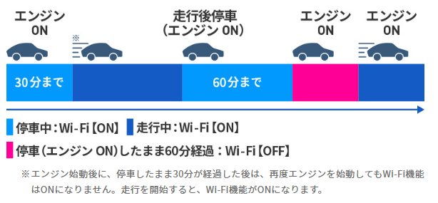 エンジンONから30分以内に走行開始しないと、WI-FIが切断されてしまいます。