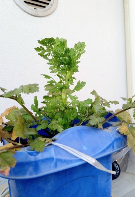こちらは増やしてるパクチー。種から大きくなったもんだ。思ってた育ち方と違うけどね。もっと暖かくなってくれば縦に育つようになるのかな?