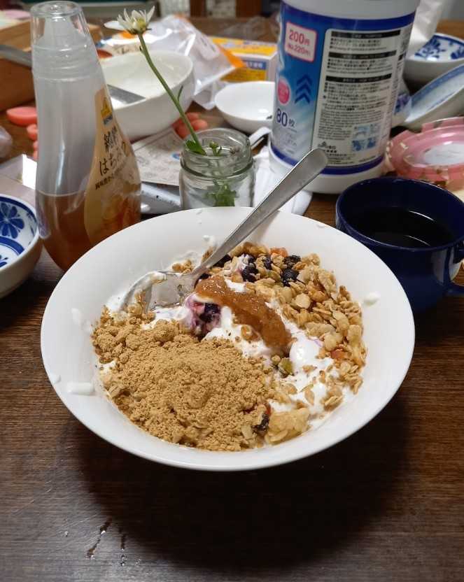 今週御殿場アウトレット行こうね♥️って言われてる。子に。なんで御殿場!?気に入った香水があったんだけどそこにしかないって言う。香水!?私は子の希望にはできるだけ応えてきた。だけど御殿場遠いなー。。。お盆にも特にどこにも行かなかったし(私は)、御殿場行って温泉でも浸かって来ようかと思って。子はそれぞれ静岡とか熱海とか行ってる。旦那さんはフジロックとかサマソニとか恒例のフェス。ママもどっか行きたい!実家の墓参りくらいだ。🟨今日は電車乗り継ぎ義実家へ。改築のため仮住まいで借りるおうちのお掃除にー。すんごくカビ臭いのが気になって気になって気になりすぎて、そんなとこで生活したらビョーキになる!と思ったので。ハイター水をスプレー容器に入れたのと、無印ワイパーの水ぶきのやつと、キッチン用アルコールスプレーと雑巾とエアコンの掃除スプレー、、、そんなものを持参し。天井と壁から網戸、押し入れに至るまで気になるところを全部!ハイターとふきふきと。ずっとそこにいるうちに、においがするのかしないのかわからなくなってきた、、、しばらく人が住んでないおうちだったから床も臭いっつーかカビカビくんが染み込んでて?2度拭き。天井と壁はワイパーの水ぶきのやつで。おうちのカビ臭ってどうやって取ったらいいんだろうって調べたけど、、、カビはアルコール除菌とか熱湯に弱いということで。もう、持参したアルコールスプレーとハイター水とエアコンスプレーぜーんぶ使いきった。やりきった!!つかれた、、、途中で食べる用にコンビニで赤飯おにぎり買ってあったんだけど。それも食べずに。終わってから義実家のほうで栗あんどら焼きをごちそうになった。どら焼きに牛乳合うー!もう、疲れて疲れて、でもおなかすいて。昨日のばらちらしの残りとカップヌードル魚豚を食べて、さらに赤飯おにぎりも食べたーー!おいしかった。おなかいっぱい。もう寝る!ハイターとかアルコールのにおいかいだからか頭痛い気がする。そういえば、分厚いビニール手袋持って行ったが使わなかったな。雑巾すぐ汚れるし水で洗いながら使って最後はかなり黒くなったので捨てる。お疲れ、雑巾。古いおうちのカビとかって絶対全体に生えてるじゃん。もう一回くらいやったほうがいいのかなー。今度は熱湯とか?エアコンスプレーを初めて使った。振るの忘れて途中で慌てて振って。うーーん、、、そのやりかたでダイジョブ?フィルターも水洗いしたしー。この前はエアコンからすごいカビの臭い出てたもんね。じゃあ、かなり改善できたのかもしれない。そういうのも嫁の仕事だよね、やっぱり。義父、義母も歳とってきてるし体もたぶん思い通りに動かないから。家のエアコンもスプレーやろうっと。エアコンスプレー2本セットのやつを買ったから。簡単だし、部屋がビチョビチョとか全然ないし意外だった。フィルターはこまめに掃除するべきか。お風呂の浴槽のエプロン取ったとこが汚なかったのがショックで、、、まだ。お風呂に入ると体がかゆくなったりとかするのはカビなんだな。冷蔵庫に入れた食べ物もよくカビカビくんが繁殖するところを見ると冷蔵庫全体がカビカビくんいるよね、、、それって、大掃除みたいに一気に食品出してハイターとかでキレイにするべきだよね、、、だよね、、、眠、、、昨日、デエビゴ(睡眠導入剤)1錠飲んだらフラーッとなった。そんなのは初めてかもしれない。おなかすいたからデエビゴ飲んだあとにおやつラーメンとか食べてたんだけど。この感じだとすぐ寝れるか?と思ったけどそうでもなく。効いてる? 、、、のか?飲んだ後はスマホとか見ると自然な眠りが遠退いちゃうらしいので見ないようにして、これから早めに寝るようにしていこう。早起きが何しろ不得意なので。。早起きするにはまず早寝から!ね。。🟨そういえば、掃除終わった後はいつも汗だくなので今日も義母が「服貸そうか?」って言ってくれて、、、ただ、下に着てるキャミソールもめっちゃ汗しみてるし、上だけ着替えても、、、と思ったので、遠慮し。電車は涼しいのでいつの間にか乾いてた。温度差が、、、ちょっとつらい。体にこたえるわー。⬇️いつもの朝ごはん。ヘイクドオーツ、フルグラ、ヨーグルト。今回バナナがなくルバーブジャムと黒ごまアーモンドきな粉入れた。アマニ油はいつも入れてる。青梅煮たのも。