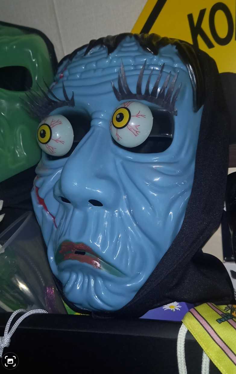 私のお友達はLINEゲーム!広告が多くて中には長いのもあるのが困ったところだけど、もうずっと3つをシャッフルで使ってるの。ニンゲンノ、、、トモダチ?、、、ウーン、、、ニンゲンノ?うん!やっとこさ国勢調査をやったとこ。紙で送ろうかと思ったけど、書き始めてみたらどうやらうち5人家族だから紙をもう一枚もらわなくてはならないのでは?ということに気づいてしまい、面倒だけどネットで回答しよう!と、ログインしてみたら意外とカンタンに終わってちょっと拍子抜けした。前の時は気力なくてできなかったんだよね、、、紙もネットも。こういう、精神的な病気を抱えてる人はどうなの?なんか、自分にはとてつもなく大変なものだと思ってたよ。。。その時によって、内容は違うのかな?前回のもざっと最初のほう見ただけてで諦めてしまったので内容は覚えてないぞう。大変。10月になっちゃう。そういえば、10月といえばハロウィンなので、私の顔をブルーに塗ってつけまつげを付けてハロウィンっぽくしてみたよ⭐かわいー🎵いや、これ自分じゃないっす。100均で、お面買いましたよ。なんか、今までそんなにハロウィンっぽいことしたことなかったけど、気分だけ。ハッピーハロウィン!という掛け声はおかしいのでは?ハロウィンはそもそもハッピーなものなのか?お盆みたいにこの期間だけ死者がうろついてて、連れていかれないように魔女などの仮装をする、、、とかだったような。みなさんハッピーならなによりです。ハロウィンならではのお菓子とかお店に並ぶし。カラフルでいいよねー。紫とかオレンジとかいう組み合わせ、好き。一度は魔女の仮装をしてリンゴを持って歩こうかなって思ったんだけど。いかにも本物っぽい杖とか持ってさ。顔は上の写真のお面で。いや、怖いわ!子供泣いちゃうよ。そーっと廊下に立って子(B)を待ち伏せしたらものすごいびっくりしてた。変な人が家にいると思ったようだ。サプラーイズ!ご老人とかね。心臓悪い人とかを驚かす時は気をつけましょう。夜道は怖い。ホラーだよね。🟧晩ごはんはラーメン。子がテイクアウトしてきて。私は朝ズバーン食べたのでラーメンのおなかじゃなくて、スパゲッティの残りを食べた。
