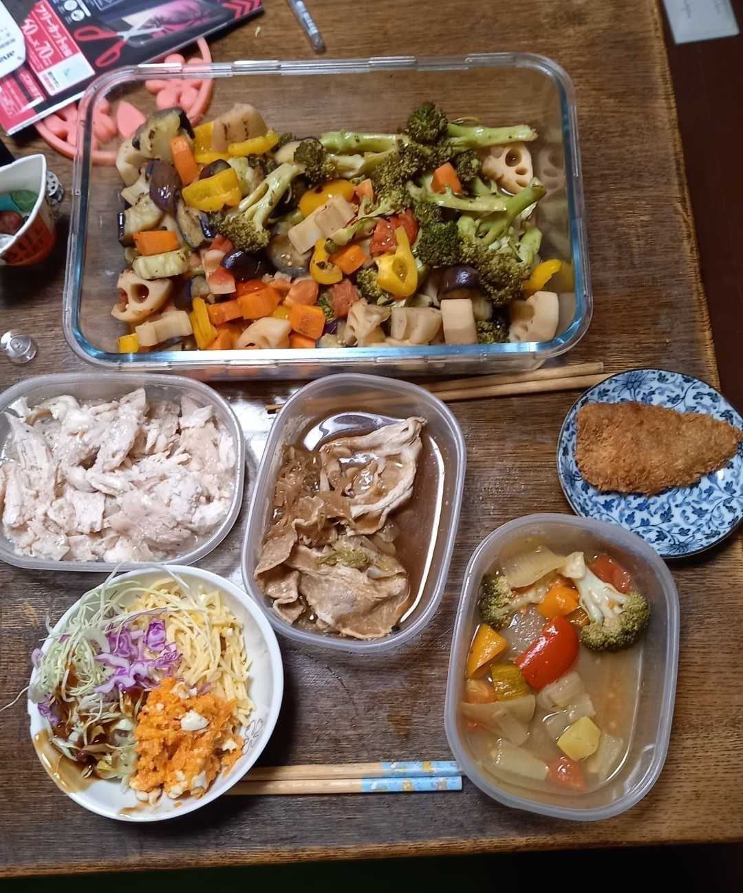 先日墓参りの時にはスマホ忘れて、「デジタルデトックス」と思いながらなんとかスマホなしでがんばった。スマホがなくて困るのは時間がわからないこと。あと、知らないところで道がわからないこと。実家のほうだったし、ローカル線の終点まで1時間あまり歩いた時は迷子になるんじゃないかと思ったけど、なんとかなったね。線路沿いに歩けば着くけど、だいたい線路沿いに道路が真っ直ぐ走っているとは限らない。突き当たった時にどっちに行けばいいのかっていうのは感覚頼りで、昔の記憶なんて当てにならないから適当。たぶん最短に近いくらいで着けたのではないだろうか。30年ぶりくらいかもしれない。その道を歩いたの。妹に言ったらクレイジーだって。でも1時間かそこらだし。🟨夏最後のセミががんばってる。ミーンミンミンミンミーーー、、実家のしかもお墓の辺りはセミの鳴き声も比じゃなかった。ここいらより自然が多いから、ものすごい数のミンミンがいる。暑苦しい声もないとさみしいような。今シーズンもう一回くらいスイカ買って食べたい。けど、冷蔵庫が満員御礼だ。整理しなくては!なにが入ってるかっつーと、けっこう前のアジフライ、トンカツ、とかポトフをミネストローネにしたやつ、、、あとはペットボトルがたくさん、そして何かいろいろ?何日か前に作ったオムライスとか。あまり食欲ないというか、ちょっとバテ気味なんだと思うけど、昨日の夜も今朝(昼)も明太子入りたまごかけご飯を食べた。雑穀米とビタバァレー入れてるし、少しは食物繊維と栄養とれてると思う。雑穀米はプチプチが多め、いつも飲み込んでるけどちゃんと噛むから時間がかかる。年金、健康保険料の払い込み行かなきゃー。子の年金も今年肩代わりしてるので、けっこう負担が大きい。2人分の年金と自分の健康保険も、、、痛いよー。昨日は唐揚げを揚げた。醤油が足りなかったので、ステーキスパイスとか塩コショウとか入れたらフライドチキンみたいな味だって。確かに。生姜とにんにく、醤油少し入れたけどなんとなくケンタくんっぽい味かも。ズボンの裾上げ×2とか、やらなきゃいけないことがてんこ盛り。やる気がでない。けど、そういうわけにも、、、んーーと、、、ミシン糸がー、黒のがーー、、、どこにあるかな?だいたい、ミシン糸ってどこで買えばいいんだろう、、、うちの中探せば出てくるだろうか。🟨自分にどんな仕事ができるんだろうって思って。PC見続けるのは目が悪くなるからちょっと、、、前やってた掃除とかどうだろうなーとか。自分で作ったものをネットで売るとかできたらそれがいい気がするけど。自分ってほんとスキルがないんじゃないか、どれも中途半端だし、、、なんて思う。カラオケ全然行けてない。朝も今よわくて。たくさん寝てる。10時間くらいかな。日によってはもっと14とか。体力使うと次の日起きるのつらい。。。🟨お風呂の掃除をこまめにするようにしてる。たぶん、前は気付けなくて汚なかったのね。こまめにやるといいね。排水口も。お風呂の椅子も。でも、お風呂ってけっこう掃除するとこたくさんあるー。シャンプーとかたくさん乗ってるし。いちいちどかすのは面倒だよ、、、浮かして収納にしたい、、、ちょうどいい大きさのラックを置くか。今まで何年も住んでるのにやっとそのことに気付けたの。でも気付かないよりマシだろう。よし。なんか、考えよう。ちょうどいい大きさのを網状のなんかでDIYとかね。少しずついろんなことに興味が持ててるのかも。いい兆候だよね。でも、生活リズムぜんぜんダメなんだよなーー。🟨晩ごはん。野菜は今日作ったマリネ。子が作ったスパゲッティサラダとニンジンのサラダも一緒に食べたけどおいしい🎵あと、残り物消費。野菜たっぷりで体のデトックスっぽい。