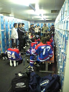 ってJ太郎のアイスホッケーの試合です。先週末に小学校低学年(4年生までだけど)の試合があったのですが、2連敗。でも、子供達はしっかり頑張ったし「負けた悔しさ」も経験出来て、これはこれでいい、って事にしましょう(笑)。J太郎が所属するのは神戸にあるJrのアイスホッケーチームです。しかし、近年通年で営業しているアイスリンクが少なくなって、今年からは兵庫県には通年営業のアイスリンクはひとつもありません。4月から10月まではインライン(ローラーブレード)ホッケーを練習したり、他のリンクに行ったりとなかなか大変です。それでも、ヒューストンのホッケークラスよりも、シンガポールのホッケーチームよりも、J太郎にとっては一番充実しているホッケーチームです。シーズン中は練習が週2回あったのですが、この3ヶ月でJ太郎もかなり上達しました。子供達も皆仲良く、ホッケーの楽しさを十分に教えてもらっています。それにしても、去年の荒川静香さん以来、最近はフィギアスケート人気はすごいみたいで、どこのスケート教室も初心者用フィギアスケートクラスは満杯だそうです。あぁ、それなのにリンクがないなんて...。でもまぁ、素人が想像するだけでも、アイススケートリンクって維持費とかがすごくかかりそうだし、採算を合わそうと思うと大変なんでしょうね。試合前のミーティングの様子。