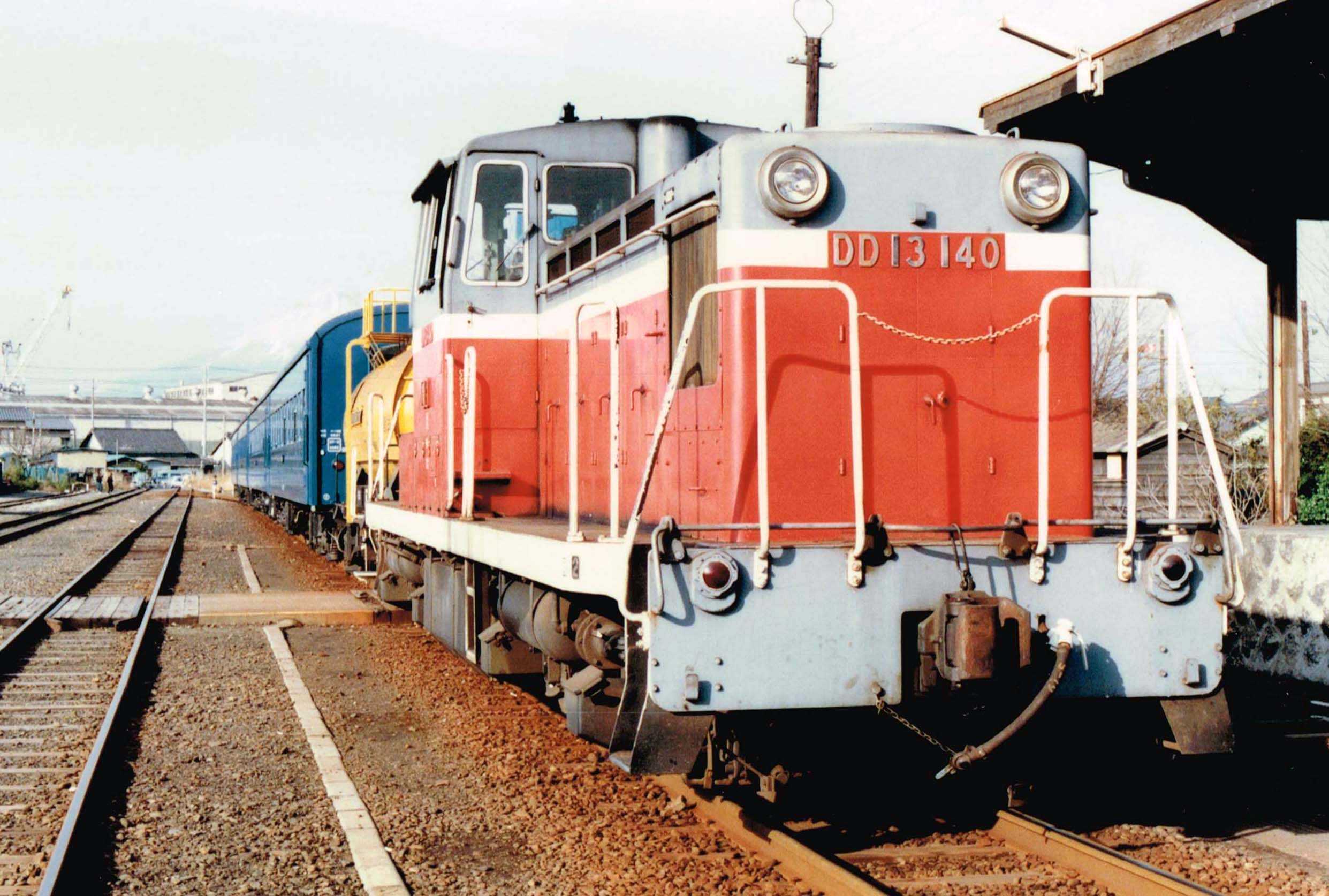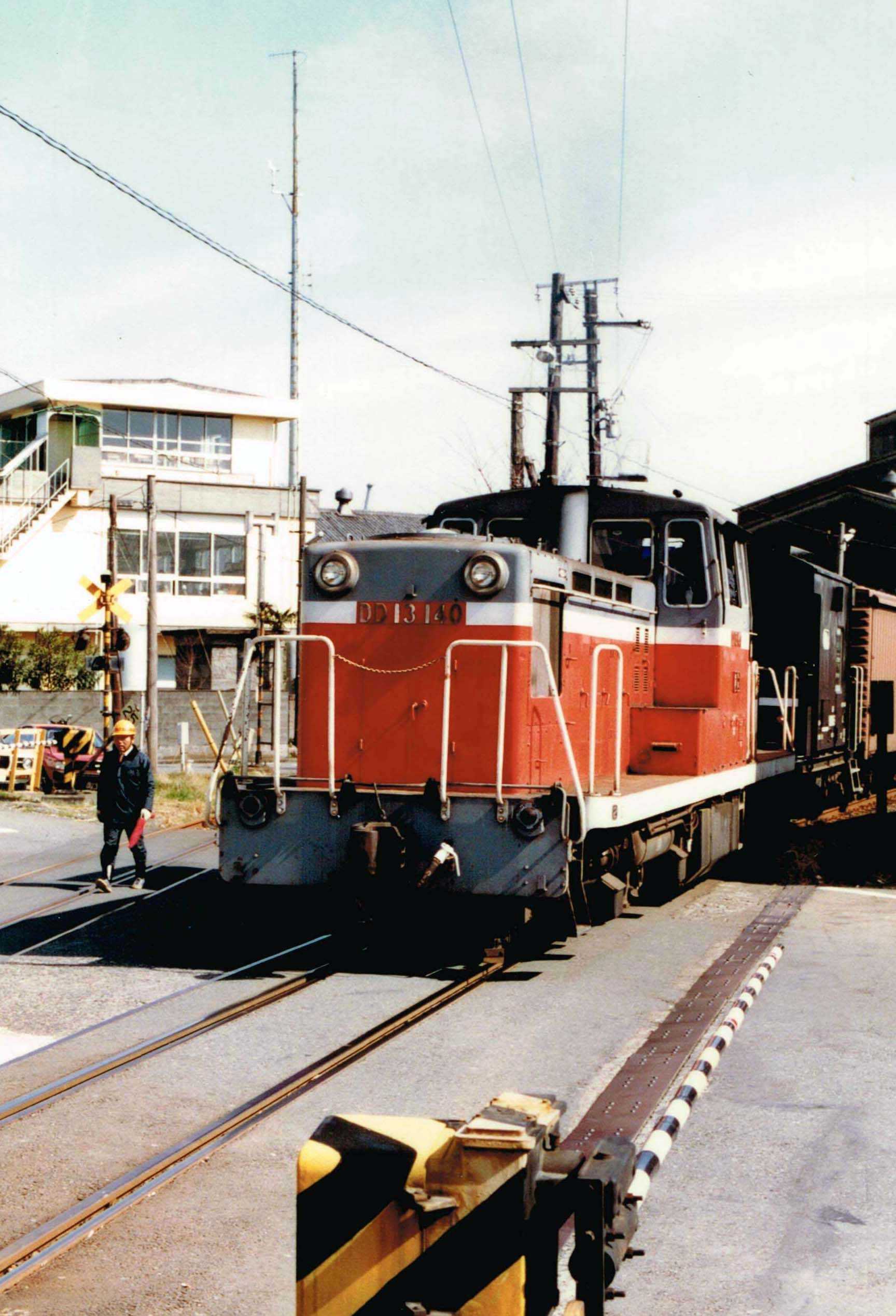 DD13140牽引 貨物列車:清水港線清水港線に置きまして、ロケハン移動中に偶然出会った貨物列車の写真を1枚だけですがご紹介いたします。※撮影は、昭和59年3月22日、清水ふ頭付近にて。DD13140牽引 貨物列車清水駅から線路伝いに歩き始めると、急に踏切が鳴り出しました。夕方の上りまで列車は無い筈と思い込んでいたのですが、ここにDD13が貨車を牽いてゆっくりとやってきました。貨物列車と言うよりは入換列車のような感じでした。左横に操車係が写っているので、入換扱いの可能性が高いですね。緩急車の連結廃止前であったことから機関車次位にはヨ8000がしっかりと連結されています。カーブがきつくて後方に何が何両繋がっていたのか思い出すこともできませんが、59・2大合理化後でありながらも清水港線では車扱い一般貨物輸送が残っていたことの証明になる写真です。