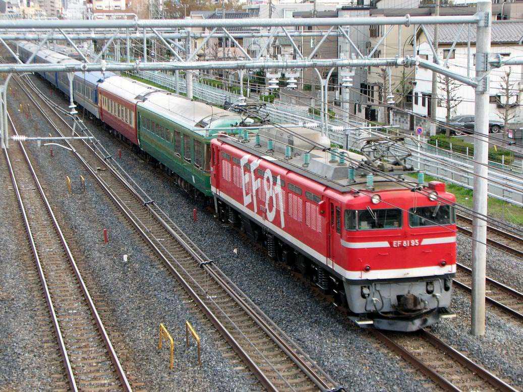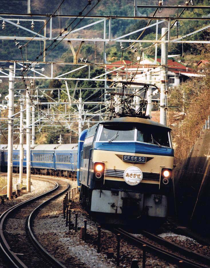 EF66牽引グレードアップ寝台客車:寝台特急「あさかぜ」「あさかぜ」は、東京~博多間を結ぶ寝台特急列車。昭和31年11月に誕生した、戦後初の寝台特急です。牽引機は、誕生時からEF58となっており、その後、EF60500番台~EF61~EF65500番台~EF651000番台後期と、他の東京発着ブルトレと同様の経緯を辿り、さらに、ロビーカーの連結により牽引定数の増強が必要となり、EF66が牽引するようになりました。昭和62年2月15日 根府川~早川間にて EF6653牽引新幹線博多開業により徐々に九州夜行が傾き始めてきた頃、ロビーカーを連結したりカルテットなど個室寝台の連結により旅客減に歯止めを掛けようとして様々な工夫を行われてきましたが、その中でも陳腐化しつつある25形車輌を思いっきりリフレッシュし、かつての「動くホテル」として絶賛された時代を取り戻そうと施工されたのが車輌の「グレードアップ化」でした。グレードアップした客車たちは金帯を纏い、700番台を名乗りました。何とかその後も生き延びた「あさかぜ」でしたが、スピード優先の時代には勝てず、結局は力尽きてしまいました。しかし、その精神は「北斗星」用の客車へと受け継がれています。また、同車に使われていた700番台客車は、「あさかぜ」からの撤退によって「はくつる」へと活躍の舞台を移しましたが、それも老朽化と共に役目を終えました。尾久客車区に保存留置され、日に日に色褪せていく姿を見て、ブルトレ時代の終わりを寂しく感じていた記憶が蘇ってきます。しかし、20系から始まった高級寝台列車「あさかぜ」は、永遠に心の中の”スター”である事に変わりはありません。