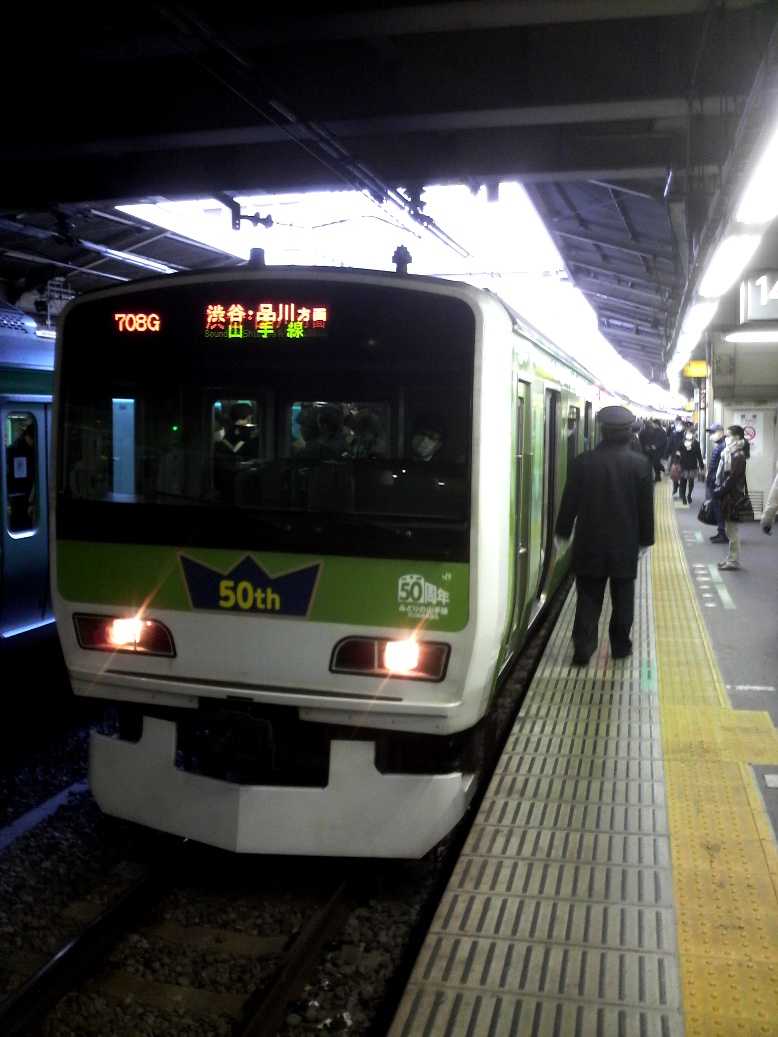 E231系:みどりの山手線(50th)平成25年、山手線のラインカラーがうぐいす色になってから50周年を迎えるということで、車体をうぐいす色にラッピングした編成が登場しました。平成25年1月16日から運行を開始したみどりの山手線は、好評のうちに平成25年12月28日をもって運行を終了しました。1年間走るというのはかなり長いプロジェクトであり、飽きが来てしまうのでは?とも思ったものですが、ここに変化を付けて様々な列車を設定した辺り、国鉄時代にはなかった頭の良さを感じました。平成25年2月4日 新宿駅にてまだ走り始めて間もない頃、50thのヘッドマーク付きで運転されました。通勤時に埼京線で追い越したため、ケータイで撮ったのがこの写真。そのうちきちんと撮ろうとは思っていましたが、撮影のついでに待つもののタイミングが悪くて撮影することができませんでした。この後、約1年にわたって様々な装いで運転されました。追ってその記録をご紹介したいと思います。