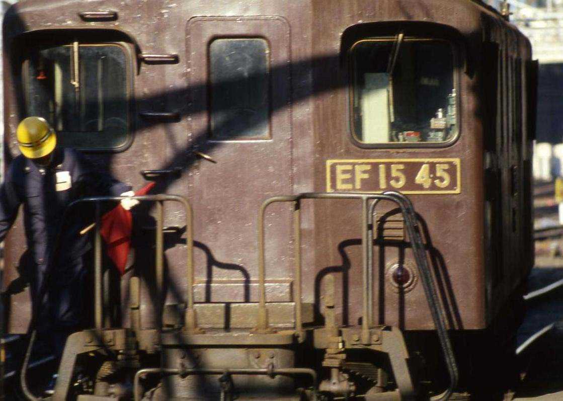 国鉄旧型電機 EF1545(八王子機関区)EF15シリーズ、今回は八王子機関区所属の45号機です。昭和54年頃? 撮影場所不明当時は駅撮りのスナップの記録を取っていないので、全くもって不明な写真です。別編集した際、東京機関区の所属で上野駅で撮影したものとばかり思っていたのですが、同機は東京機関区に所属した経緯は認められず、上野駅に居る可能性はないと判断しました。では何処で撮影したのか?私が良く駅撮りをした記憶だとすると品川駅か東京駅となりますが、ここでも同機が貨物列車をホームまで引いてくる可能性はありません。だとすれば、新宿駅か八王子駅くらいしか該当駅は無いのですが、新宿や八王子と言うのは撮影で訪れたのがほんの数回で、まったく記憶に甦ってきません。何でこんなドアップで撮っているのかと言えば、この頃はFD300mmを手持ちで振り回していて、何でもかんでも望遠で撮っていたんです。かなり無理がありますし、ブレちゃってます。周りの状況が判ら無い分、分析するのが難しい記録となってしまいました。45号機昭和26年12月26日 川崎車両製 沼津機関区昭和55年 3月35日 廃車 八王子機関区
