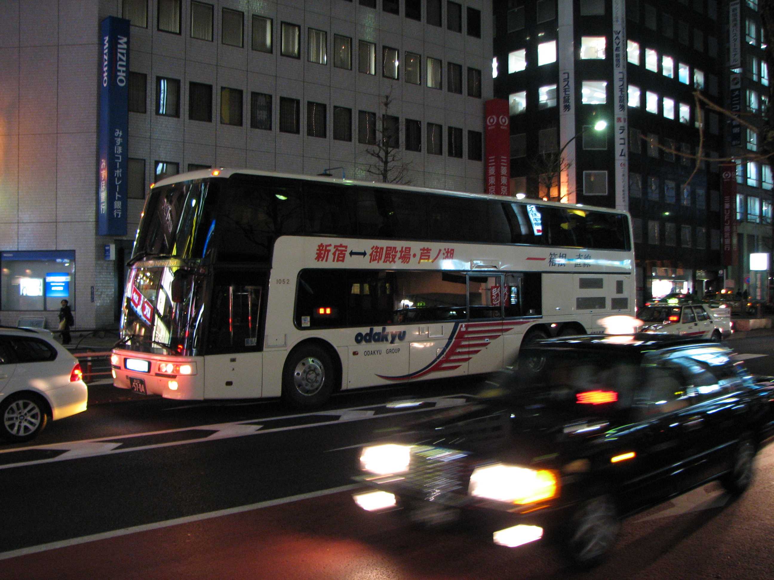小田急箱根高速バス 三菱ふそうエアロキング:「箱根一直線」三菱ふそうエアロキングシリーズです。今回は、新宿駅~御殿場・箱根を結んでいた、小田急箱根高速バスで使用されていたエアロキングです。※撮影は、平成19年3月23日、新宿駅西口にて。小田急箱根高速バス 三菱ふそうエアロキング 「箱根一直線」仕事帰り、京王プラザホテル近辺で時間調整を行っているところを良く目撃しましたが、当時はデジカメを持ち歩く習慣がなかったので、なかなか撮影することがありませんでした。この時はたまたまデジカメを持っていて、残業帰りに駅近くで見掛けたために撮影することができたようです。時間も21時半過ぎで、シャッタースピードが1/8秒となっており、かなり無理のある写真です。明るいうちに撮影したいと思っていましたが、それから出会う機会がないと思っていましたら、どうも比較的に早く売りに出されてしまったようです。当時、当たった他の方の情報によると、2台在籍したうちの1台である同車は、北海道の銀嶺バスに譲渡されたようです。その後の情報を調べても記述が見つからないので、さらに譲渡されてしまったか。まあ、さすがに廃車されてしまっているでしょうね。