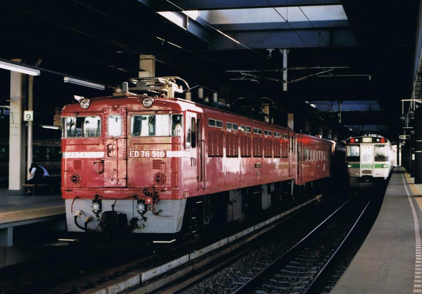 ED76500番台牽引:50系51形客車列車北海道電化区間で活躍していたED7500番台です。元々のED76という形式は、昭和40年の九州熊本電化に際してED72形の改良増備機として誕生しました。そして、昭和43年の北海道初の電化区間となる小樽~岩見沢間電化に際し、客貨両用の牽引を主眼において誕生したのがED76形500番台です。メカ的なことは私は良く理解できないのですが、B-2-Bという軸配置の特徴を除けば、実質的に別形式と言える機関車だそうです。電化当初の昭和43年に501~509号機が、翌44年の旭川電化開業に際し510~522号機が誕生しています。今回は、活躍晩年に50系51形を牽引していた頃の写真です。平成元年7月3日 札幌駅にて ED76510平成2年9月6日 豊幌~上幌向間にて ED76510平成2年9月6日 豊幌~上幌向間にて ED76511平成2年9月6日 豊幌~上幌向間にて ED76515平成2年9月6日 豊幌~上幌向間にて ED76521平成2年9月6日 豊幌~上幌向間にて ED76522ほとんど同じく間で撮影したもので、北海道特有の直線区間、変わり映えのしない51形客車なので、絵的には面白みに欠けます。また、プリントからのスキャンで画質が悪いのはご勘弁。元々電化区間であっても電車の供給が追いついていなく、電化区間外から乗り入れてくる列車は客車又は気動車ですし、電化区間内のみの普通列車でも、気動車編成が多く走っていました。昔は通勤時間帯の長大編成に客車が使用されていましたので、ED76500が活躍する場面は多く見られたようですが、711系の増備や721系の誕生と電車の両数が増加してくると、年式の新しい50系客車とはいえ、たちまち運用から外されるようになり、晩年は通勤時間帯にホンの数本が残るのみとなってしまいました。ED76500番台牽引:旧型客車列車