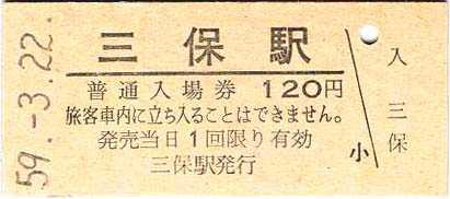 清水港線三保駅 入場券・普通乗車券・車内補充券廃止直前の清水港線訪問に際し、記念きっぷ以外にも通常発売のきっぷを買ってありましたのでご紹介したいと思います。三保駅発行の普通入場券です。当時の一般的な様式で、料金は120円でした。こちらは普通乗車券で、140円の料金帯となる三保駅から巴川口・清水までとなります。静岡局では昭和60年頃から東京印刷場が所管するようになったようですが、この頃はまだ名古屋印刷場調整のようで、飯田線などでも良く見られた区間式の様式となっています。最後に車内補充券です。この乗車券だけ翌日の昭和59年3月23日に購入しています。地図式ではない補充券で、記載駅名を見るとかなり大雑把です。さらに観察すると、発行箇所名が「三保駅乗務員発行」となっており、聞き慣れない表示です。当時の組織状況など知る由もありませんが、おそらくは清水港線運用の乗務員はこの路線専用の列車掛(車掌ではない)で、車掌区を組織するほどの規模がないために駅付けになっていたのではないかと推測します。この補充券は確か車内ではなく駅の臨時の立ち売りだったように記憶しており、補充券と記念きっぷを買っている方には業務用の封筒に入れてくれるという、他には例のないサービスが行われていました。